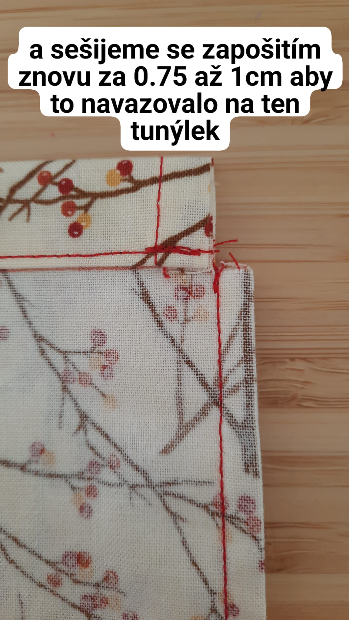 Z rubové strany povedu nové šití, které navazuje na tunýlek, je ve vzdálenosti cca 0,75 až 1 cm od ohnutého kraje.