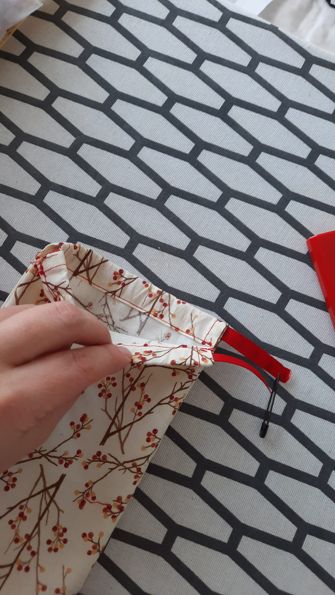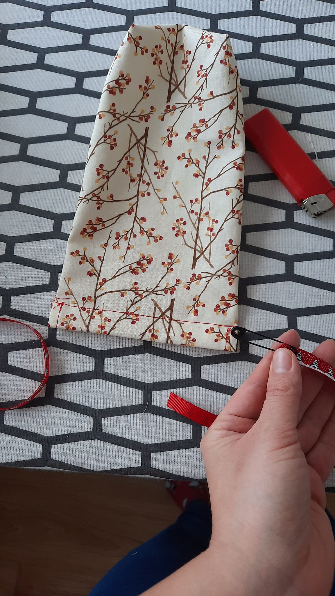 Připravíme si 2 stuhy nebo provázky na stahování. Každá bude dlouhá jako 2x šířka sáčku plus 10 cm navrch.