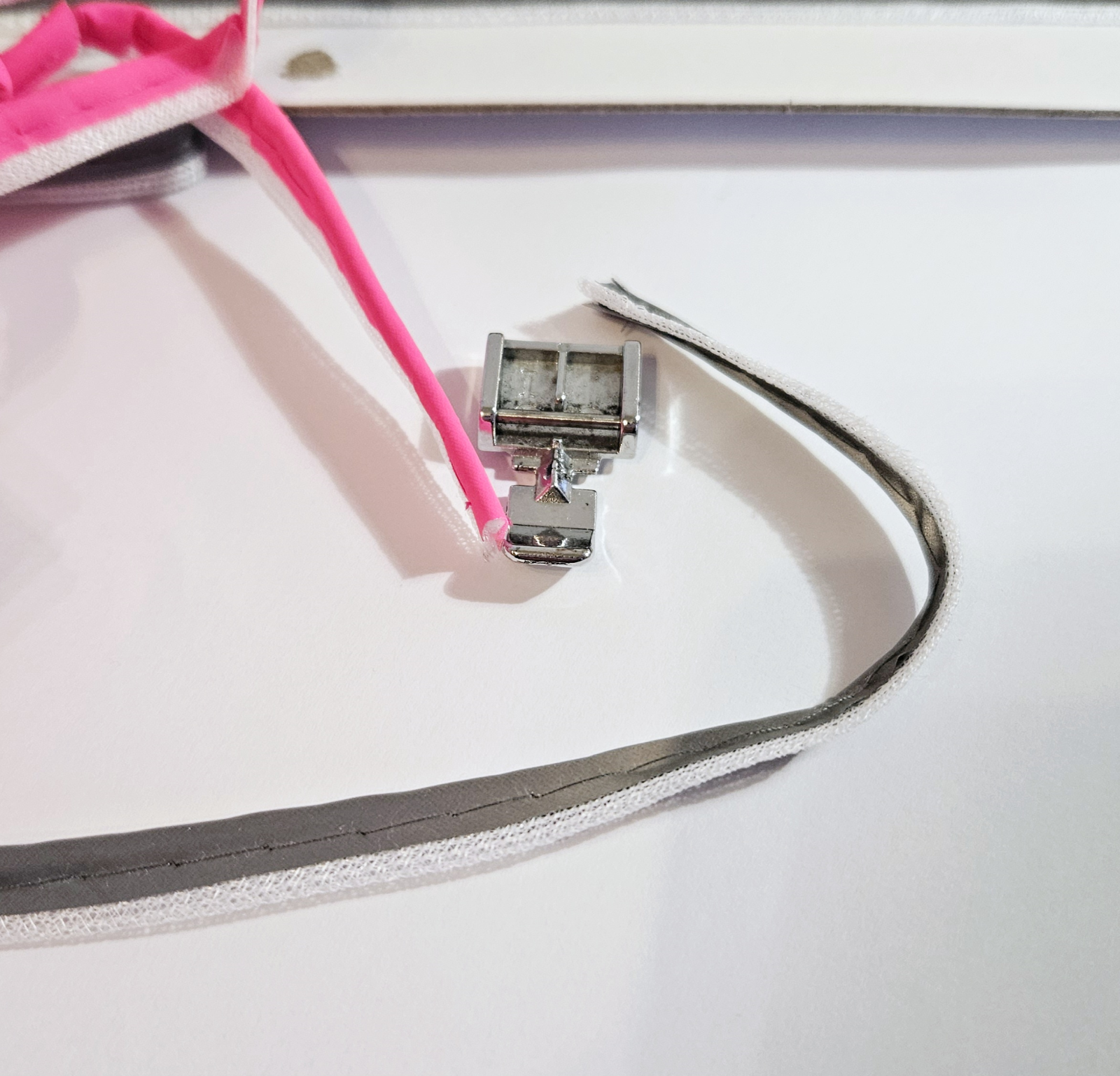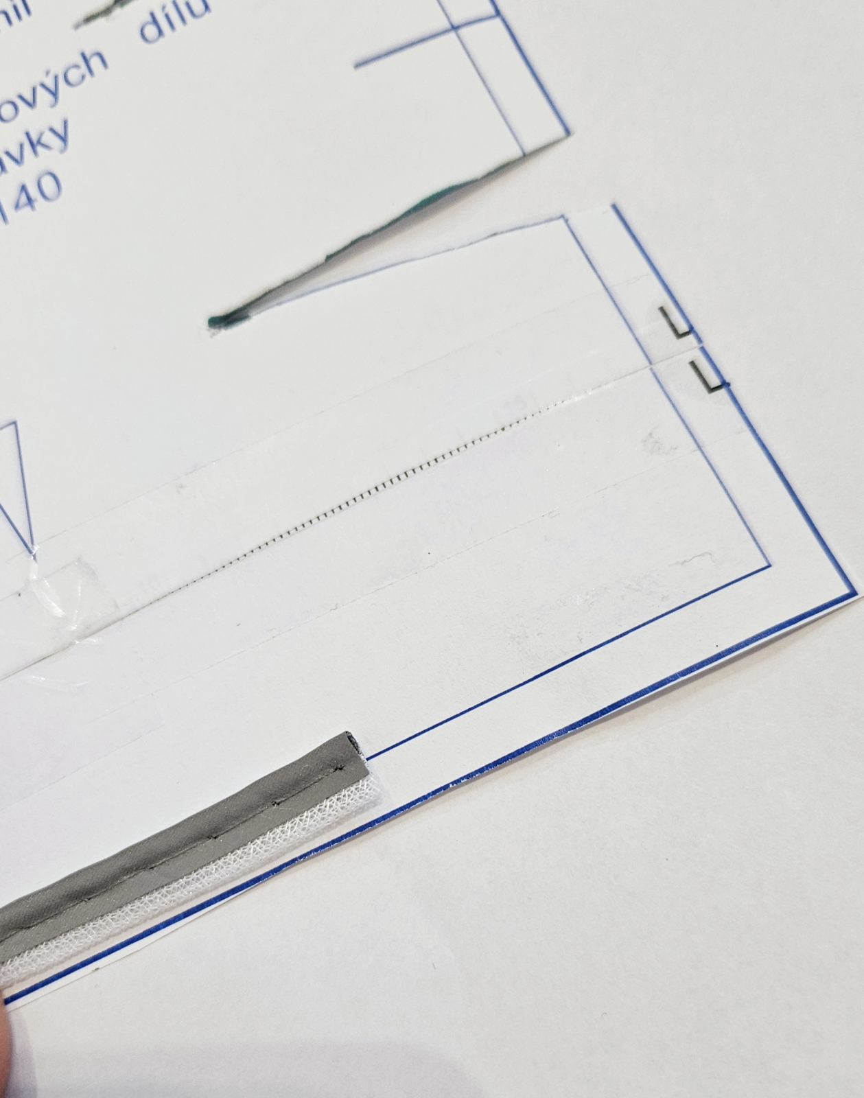 Pomocí zipové patky paspulku přišiji. Šití je tam, kde je na paspulce prošití.