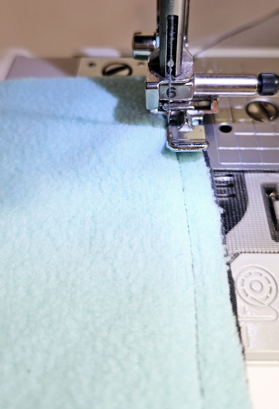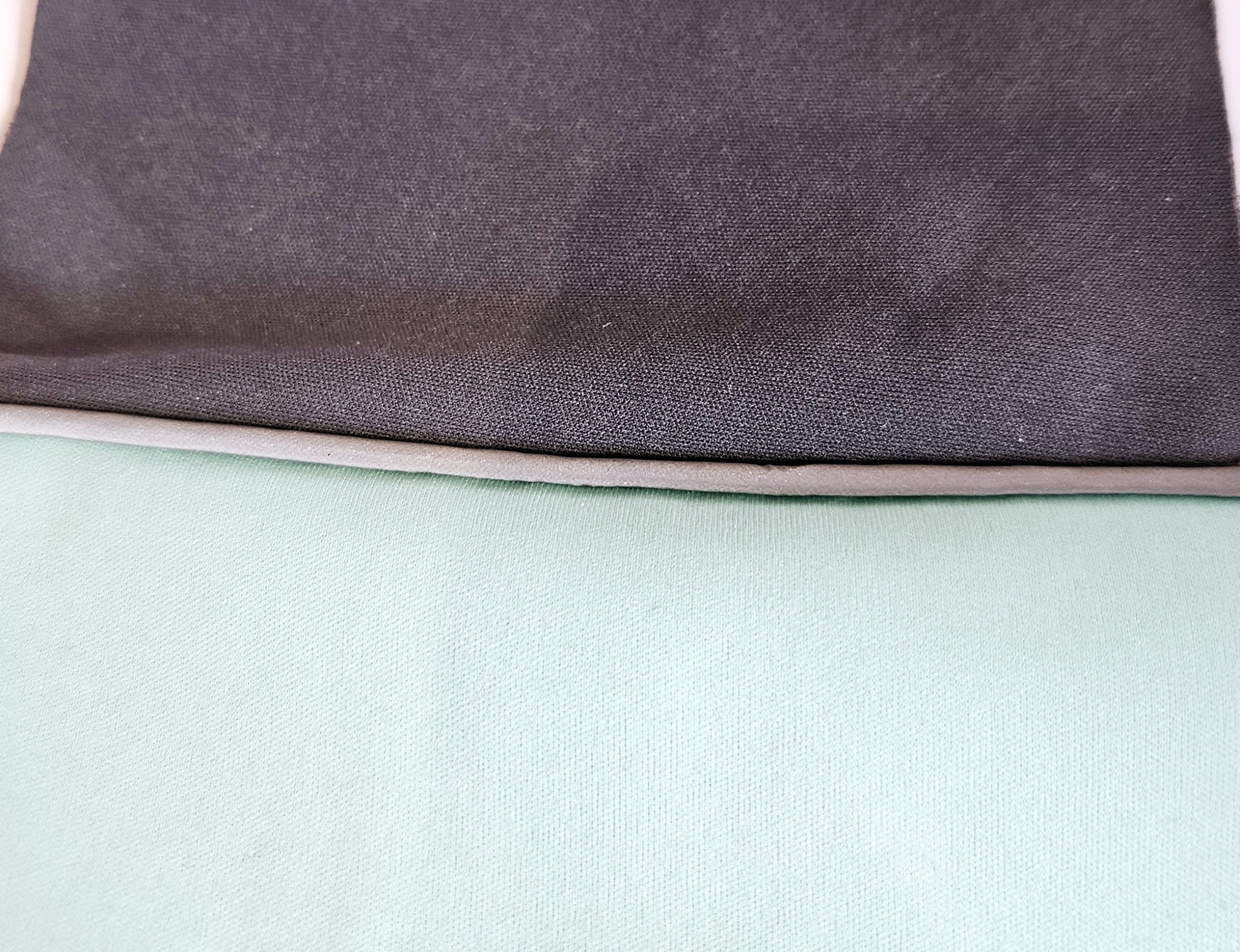 Látku přiložím lícem na líc druhého dílu. Nový díl je dole, díl s viditelným šitím je pod strojem, opět šiji patkou na zip a šití je na totožném místě jako to minulé.