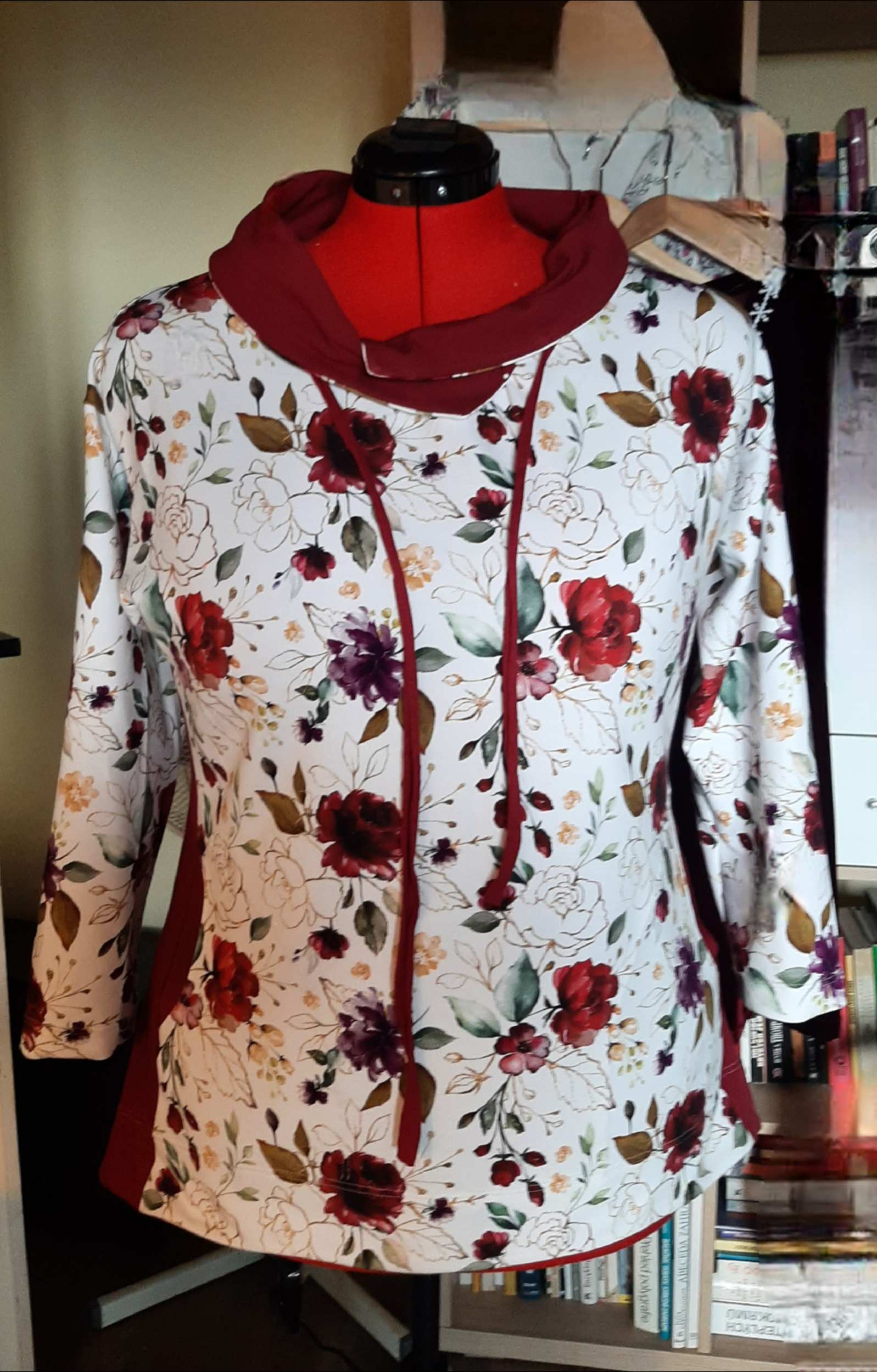 „Se střihem se pracovalo moc hezky. Vynechala jsem přeložku předního dílu a vypracovala vnitřní část předního dílu s délkou pouze pod prsa. Dost mě potrápilo sesazení předního a zadního dílu v náramenici. Manžetu bych příště střihla o malinko širší, aby nebyla tak upnutá. Délku jsme si o pár centimetrů protáhla.“