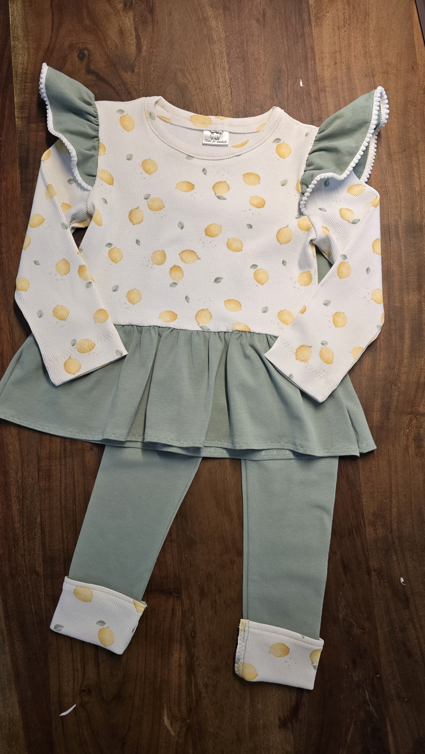 „Nastavení a šití je velmi rychlé. V kombinaci s projektorem je to opravdu fofr. V základu jsou to jen dva sešité kusy, já spodek nohavice podšila cca 8 cm žebrovaného úpletu a ohrnula, aby legíny ladily s trikem. Díky tomu, doufám, budou i lehce rostoucí a vydrží déle. Pokud by někoho zaujalo triko – vychází z životrika, zkráceného 4 cm pod pasovou linii a k tomu je našitý nařasený obdélník (1,7x obvod spodního okraje trika) a u náramenic je nařasený pruh olemované látky.“