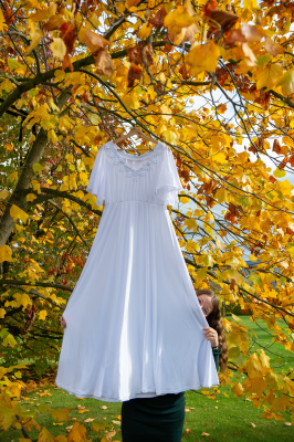 MF: „Vyhrála jsem střih s tím, že se chystám ušít šaty pro kamarádku na svatbu, která nyní proběhla - proto se můžu podělit s ostatními. Vše se šilo, jako vždy od Irči, na jedničku. Sukni jsem prodloužila a dala maximální rozšíření jednotlivých dílů pro bohatší efekt, v pase řasená (kvůli splývavému materiálu). Rukávy z šifonu, aby vlály ve větru a výstřih, který si nevěsta nakonec přála véčkem dopředu, je lemovaný hrubou krajkou. Byla nadšena! A ja taky :) “