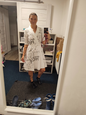 VK: „Střih je neskutečný. Velice dobře se šil. Videonávod mi neskutečně pomohl s šitím, vážně jsem se snažila dodržovat postup, pečlivě jsem žehlila, obšívala což normálně nedělám 😁 jedinou nevýhodou je, že mám moooc malé prsa a tudíž výstřih mám větší,ale to se poddalo delšími záševky. K šatům jsem si přidala límeček a jsou famózní 😍“