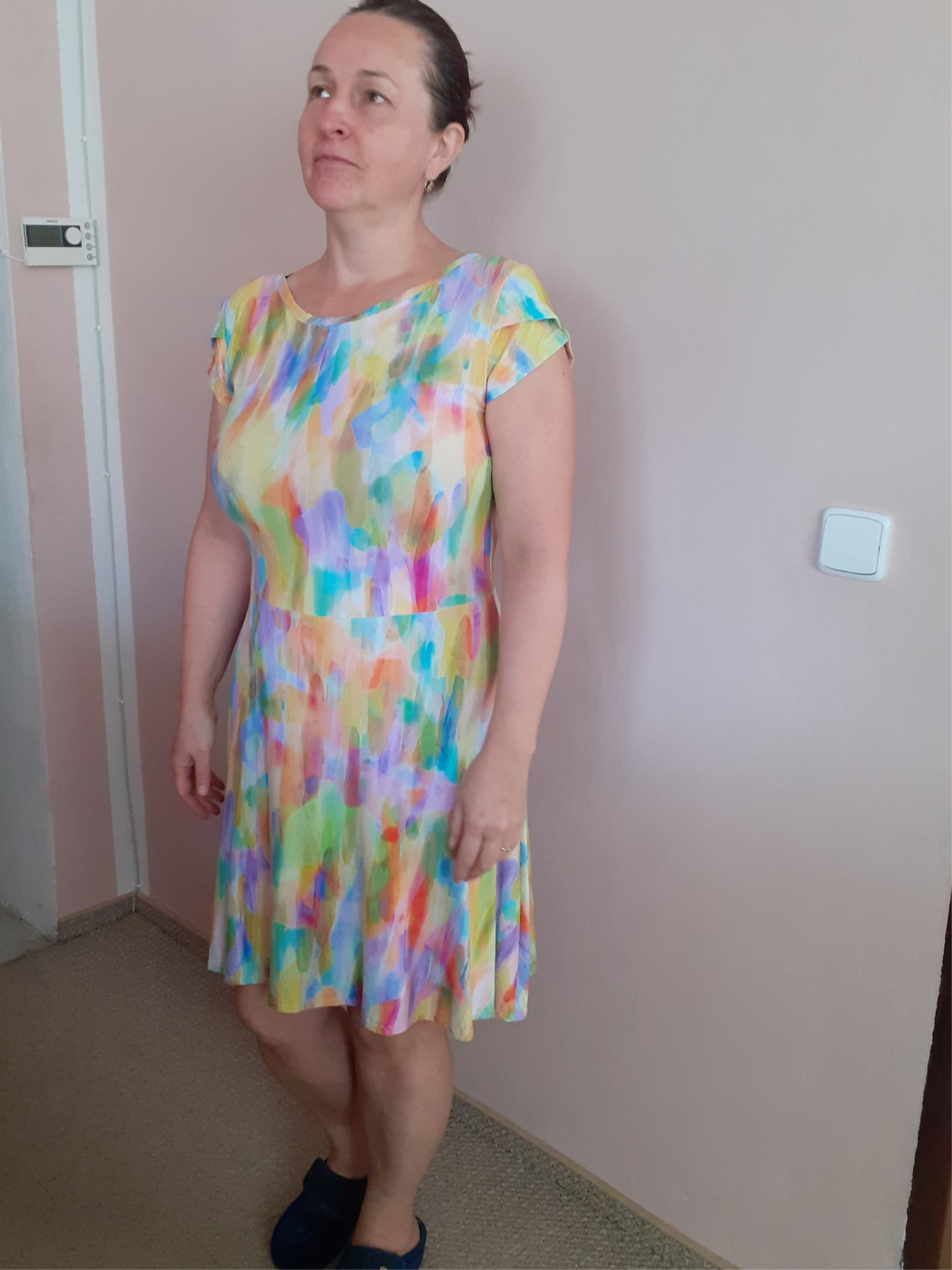 „Šaty se šily velmi dobře díky videonávodu a preciznímu střihu. Oceňuji, že jsou již přidané přídavky a nemusím je kreslit sama. Úplet byl více pružný, než jsem čekala a tak mi přidělal práci navíc. Použila jsem tulipánové rukávky z Cesmín.“