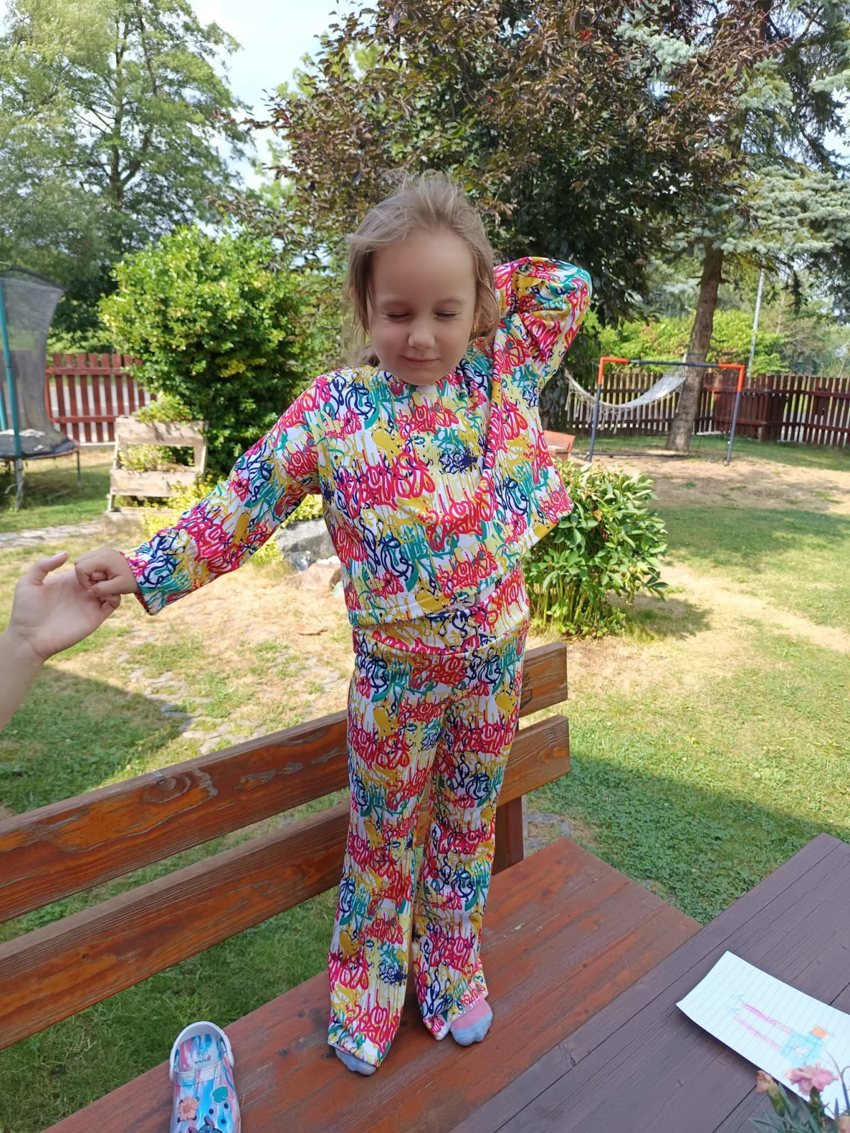 „Jako obvykle všechno skvěle na sebe sedělo. Úplně nejlepší je, že si můžu udělat střih pro dceru takový jaký potřebuji, je hubená, takže má šířkově 134 a délkově 146.“