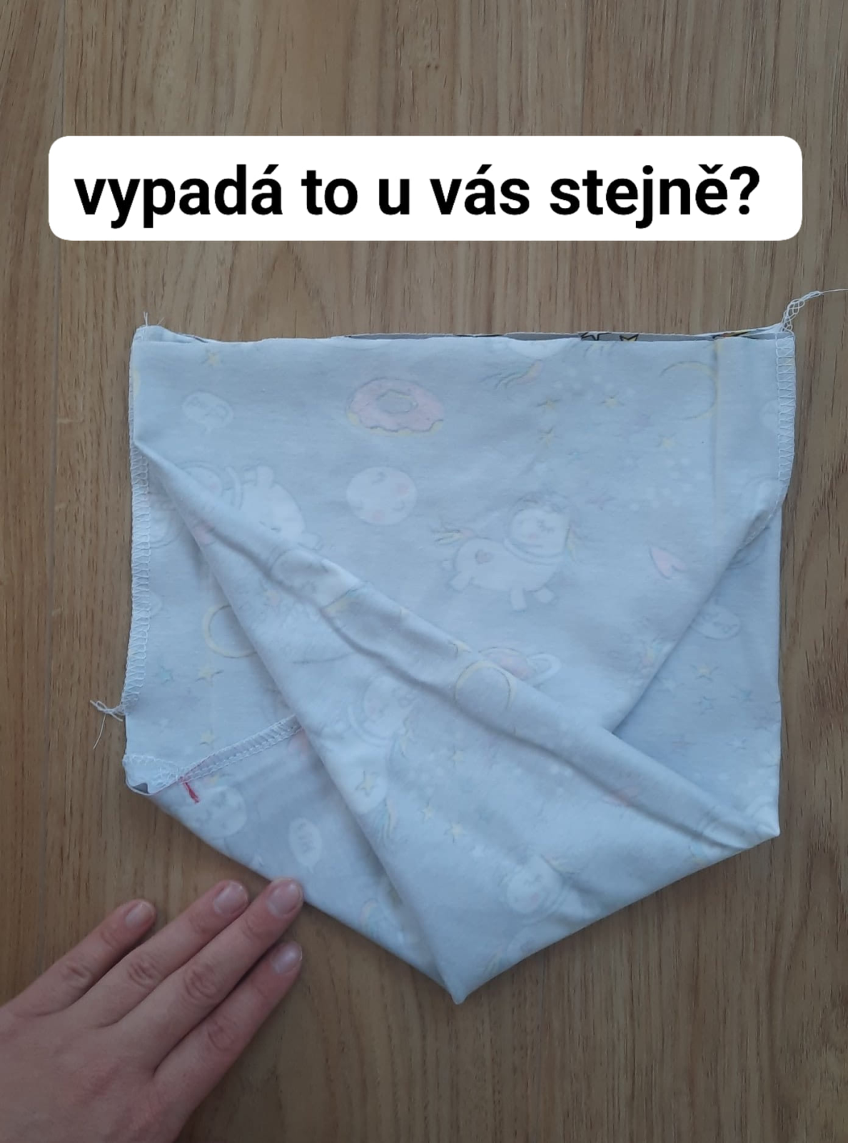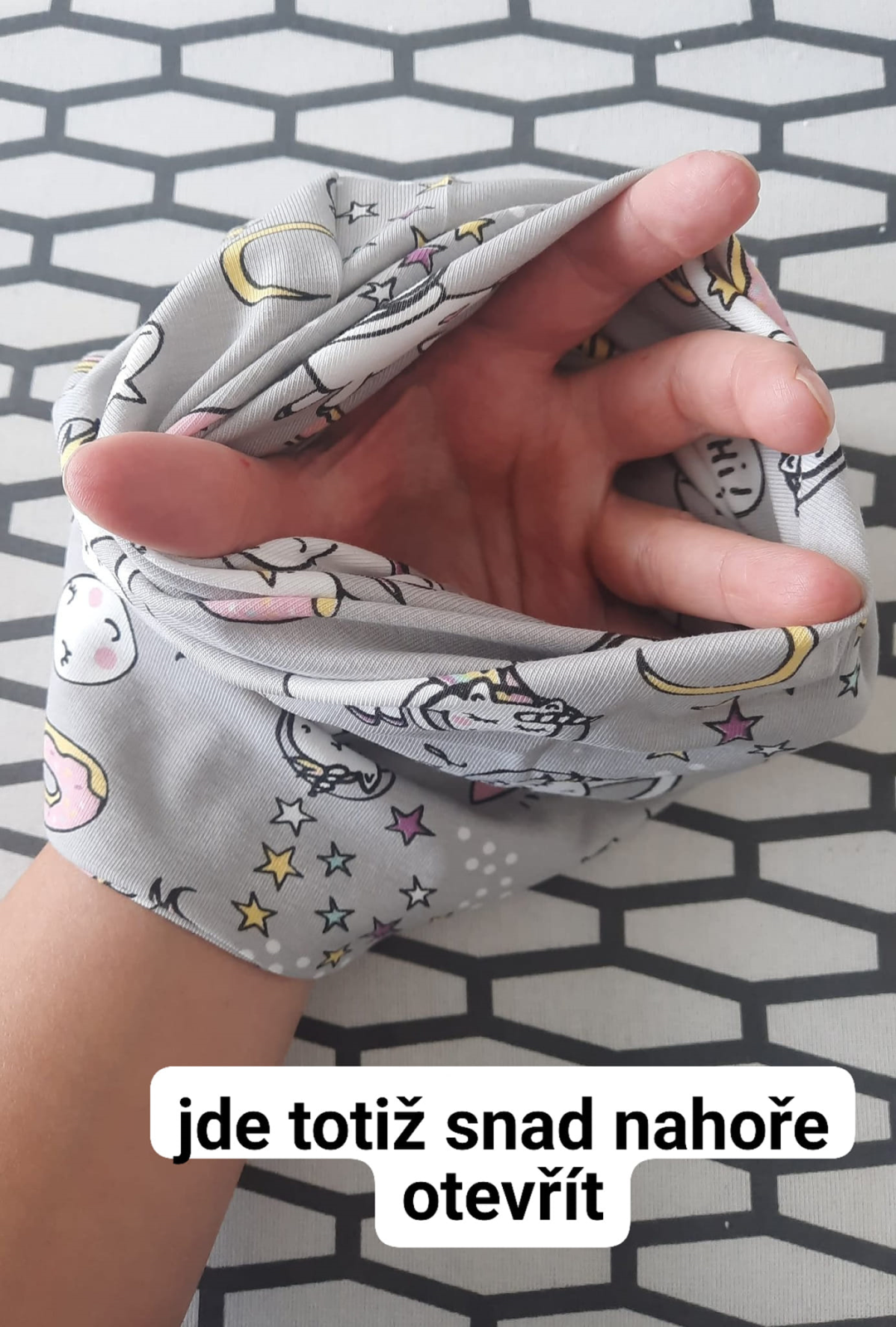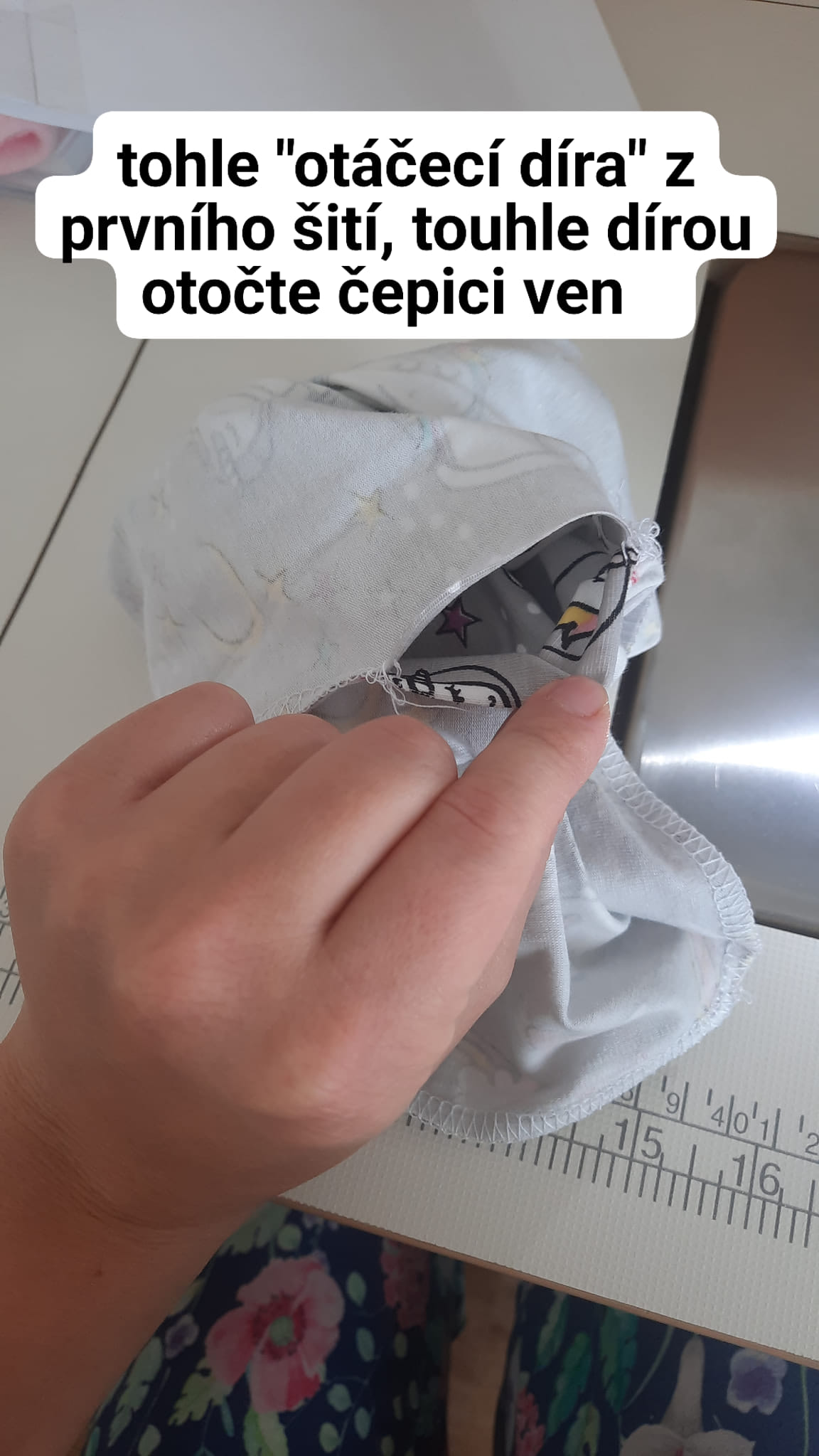 šev sešiji pružným stehem, mohu volit overlock, tříkroký steh nebo jemný entl. V boku si nechám díru pro točení čepice velkou asi na 4 prsty.