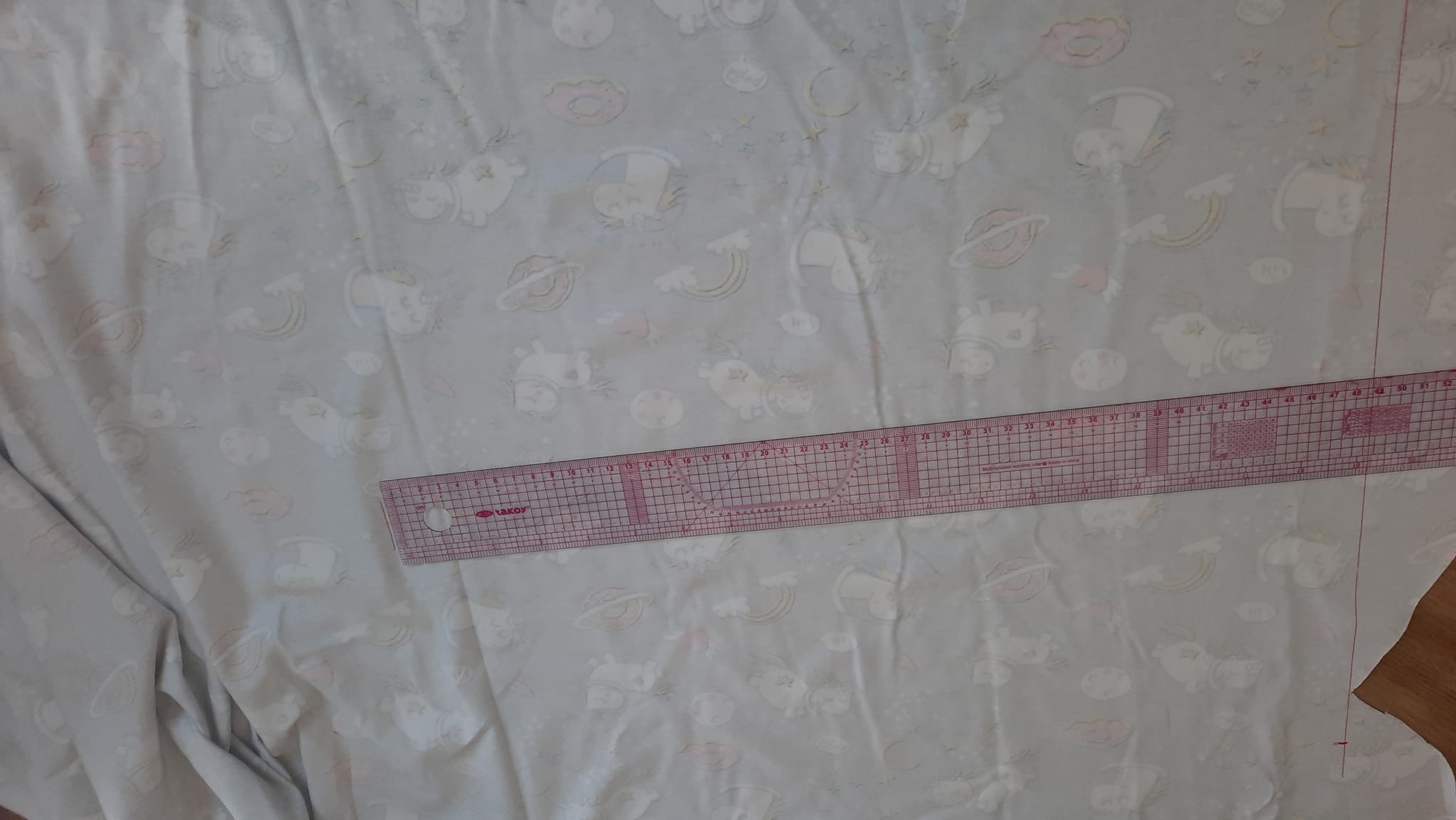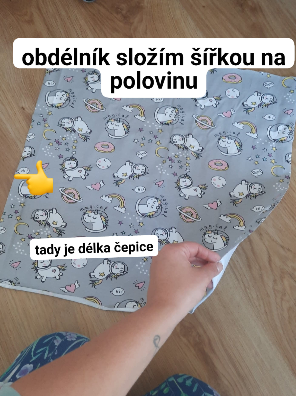 Délka látky se jmenuje osnova a poznám ji díky sloupkům, po délce nanesu délku čepice - na 4 letou dceru 50 cm. Šíře látky se jmenuje útek a po ní nanesu obvod hlavy mínus 2 cm.