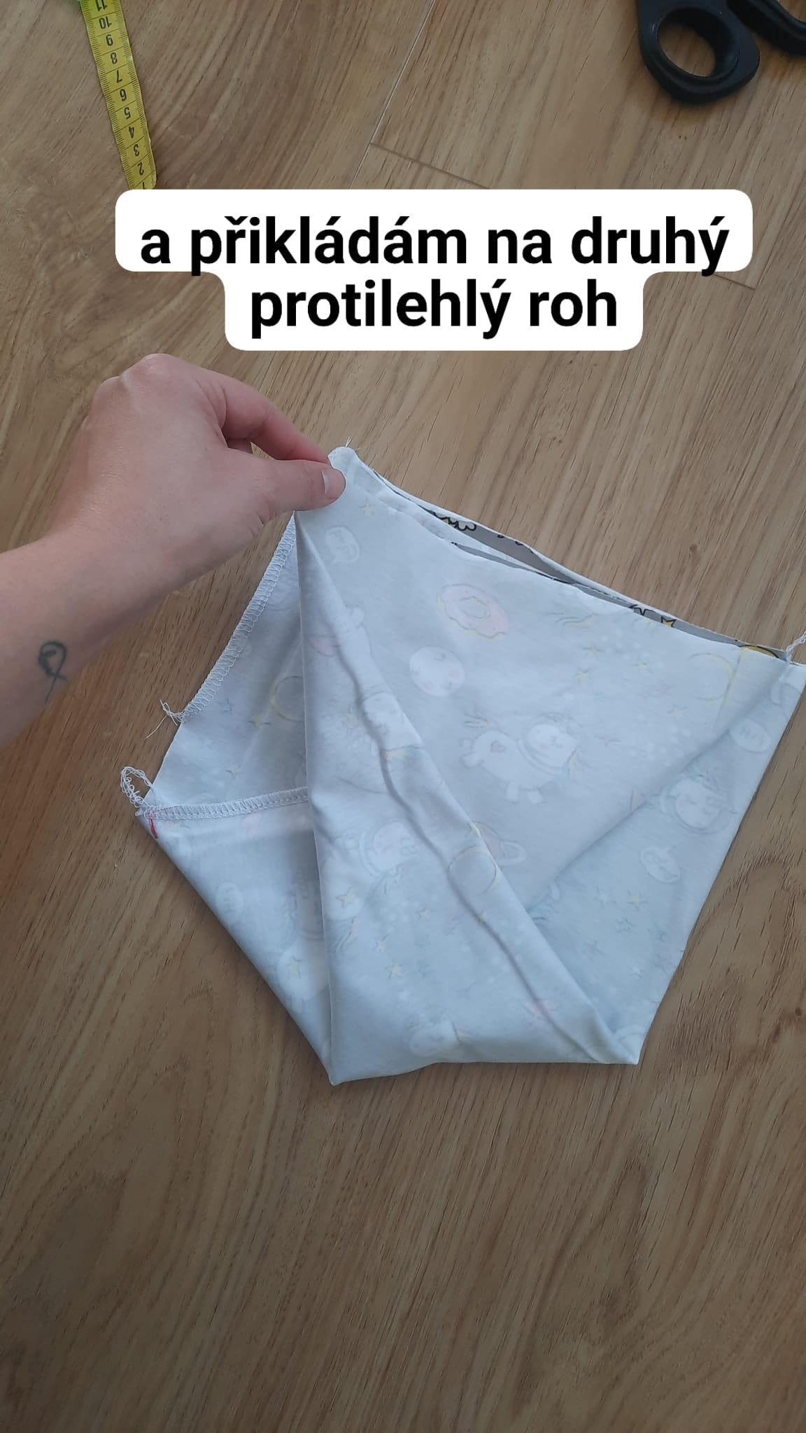 Jeden roh přiložím na protilehlý roh dle obrázku.