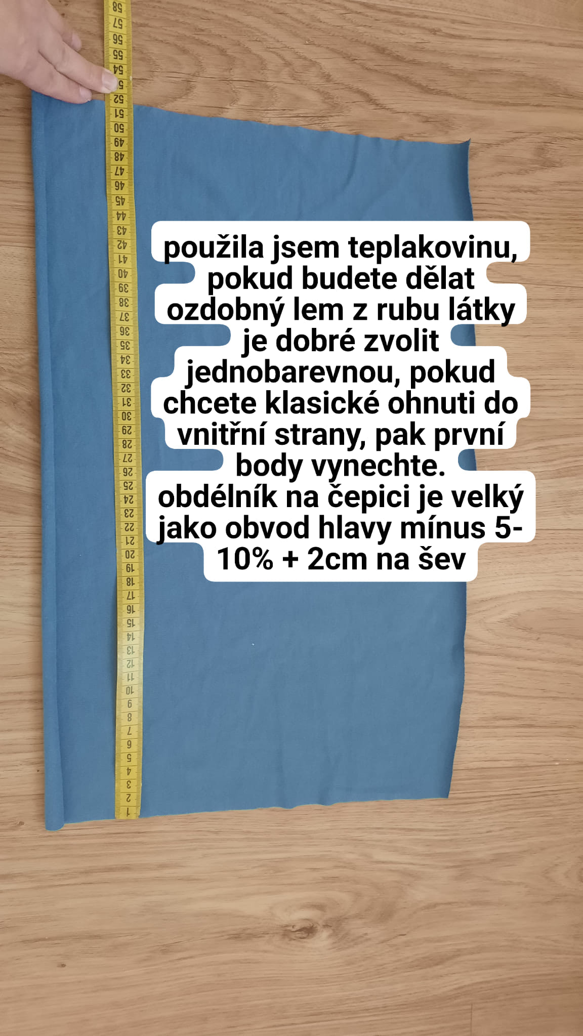 Obdélník na čepici je velký, jako obvod hlavy mínus 5 - 10% dle pružnosti materiálu. Plus 2 cm na šev. U této čepice jsem díky jednobarevné látce zvolila ozdobný spodní lem. Ten vznikne tak, že rubovou stranu ohnu ven.