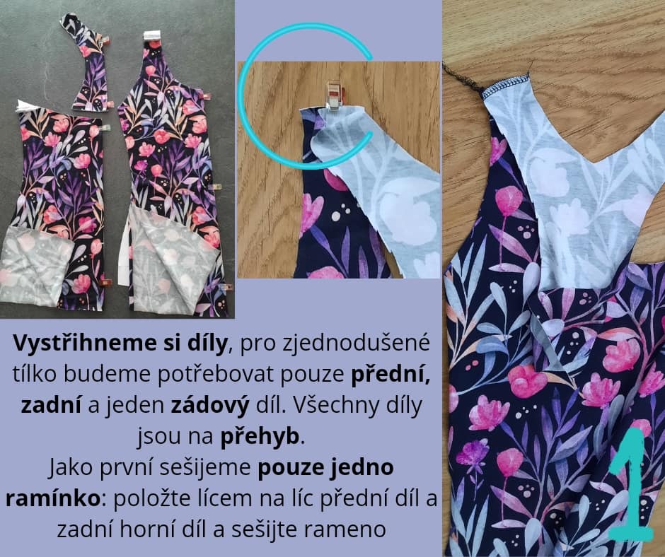 Jako první sešijeme pouze jedno ramínko: položte lícem na líc přední díl a zadní horní díl a sešijte rameno.