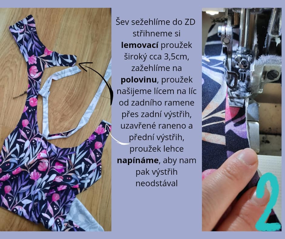 střihneme si lemovací proužek široký cca 3,5cm, zažehlíme na polovinu, proužek našijeme lícem na líc od zadního ramene přes zadní výstřih, uzavřené rameno a přední výstřih, proužek lehce napínáme, aby nám pak výstřih neodstával
