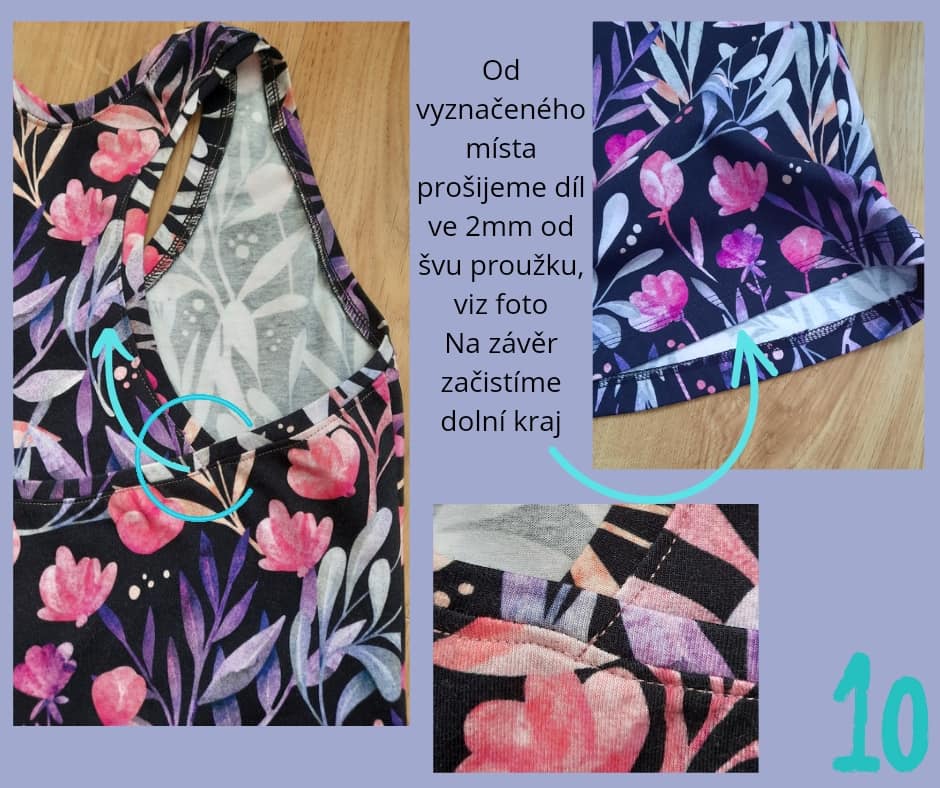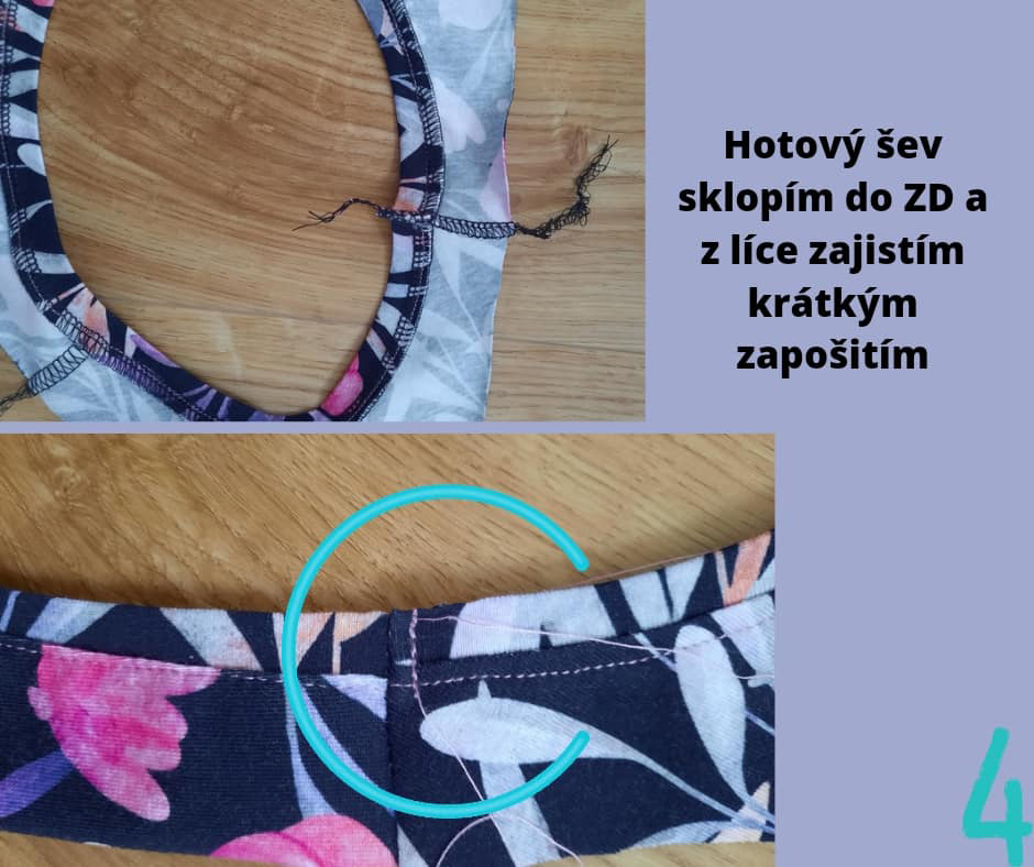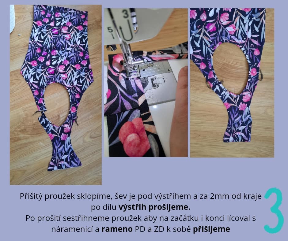 Po prošití sestřihneme proužek aby na začátku i konci lícoval s náramenicí a rameno PD a ZD k sobě přišijeme