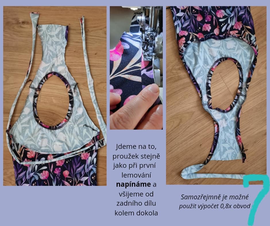 Jdeme na to, proužek stejně jako při první lemování napínáme a všijeme od zadního dílu kolem dokola