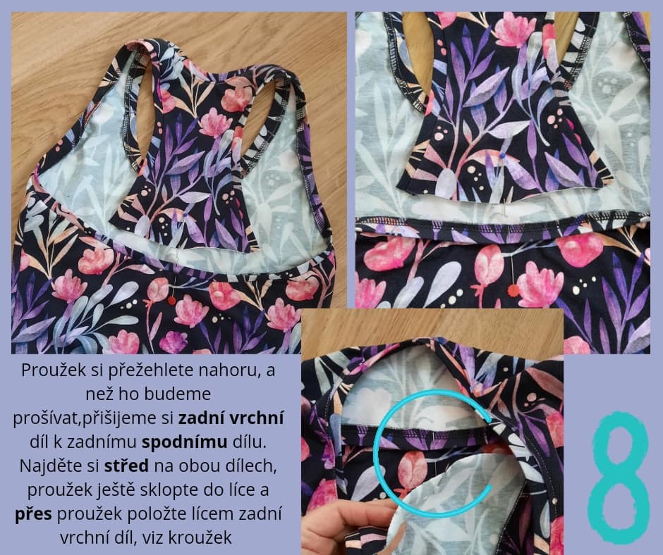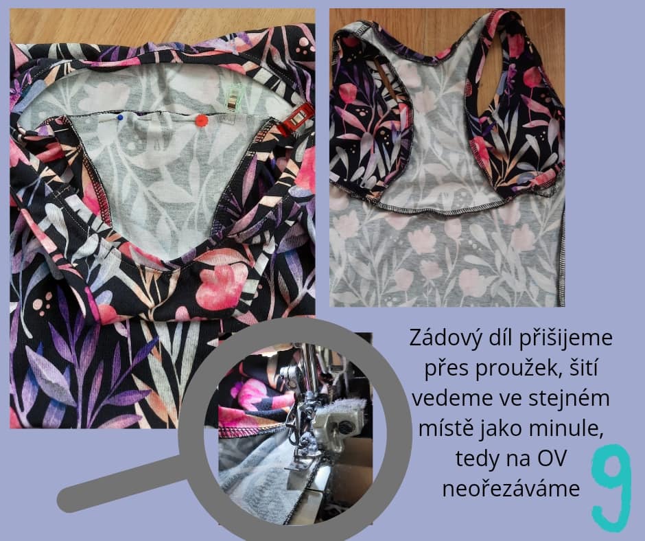 Zádový díl přišijeme přes proužek, šití vedeme ve stejném místě jako minule, tedy na OV neořezáváme