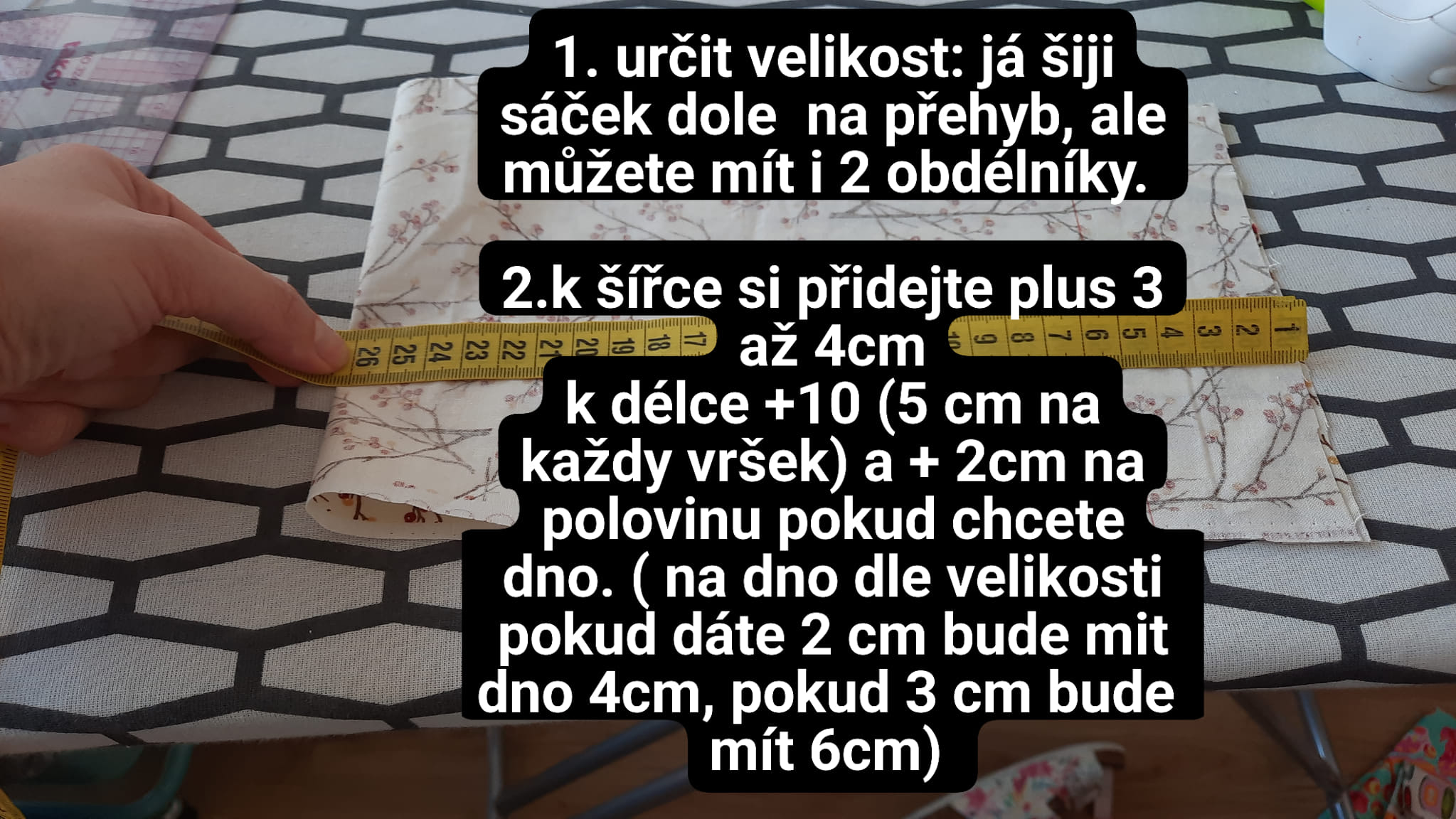 Sáček můžete ušít ze 2 kusů látky - na dnu bude šev, nebo z jednoho kusu. Tak ho budeme šít zde. Na šířku sáčku přidejte 3 až 4 cm, k délce pak 5cm na každý tunýlek, tedy celkem 10 cm pokud bude váš sáček dole na přehyb. Navíc pro vytvoření dna další cm. Já přidala na dno 4 cm.