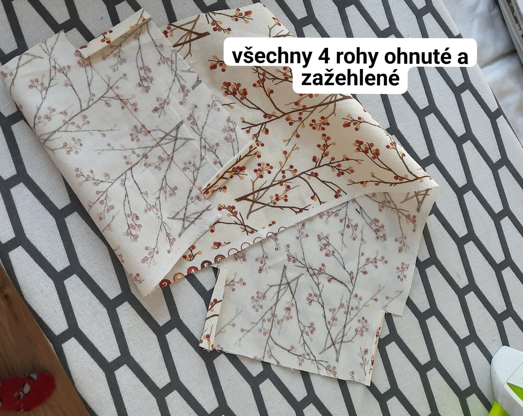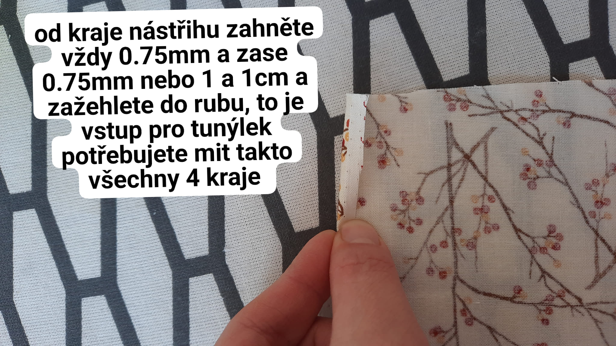 Nastřihnuté kraje 2x podehneme a přežehlíme, tím vytvoříme po odšití vstup do tunýlku.