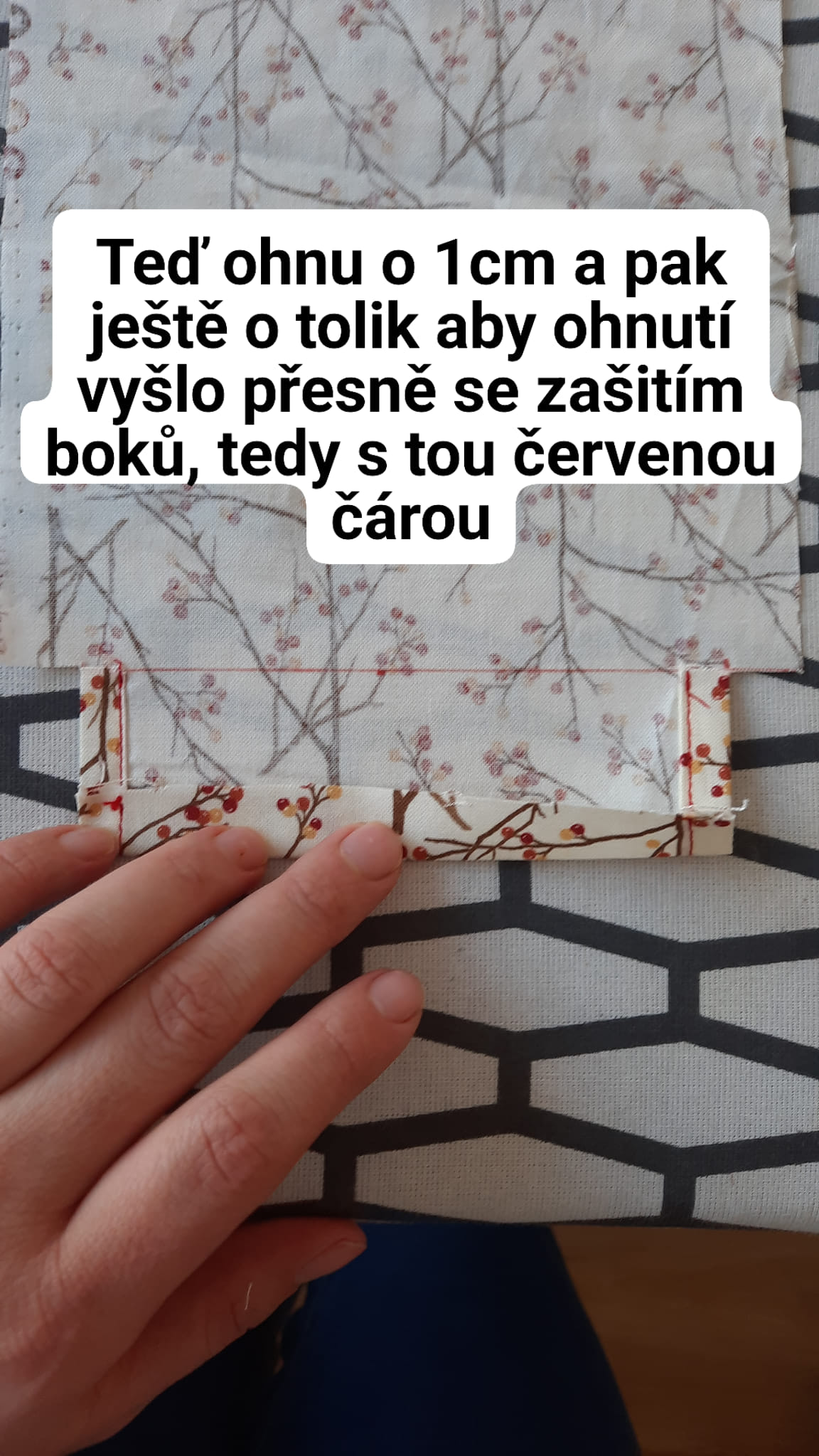 Nyní ohnu vrchní kraj o 1 cm, přežehlím a pak znovu ohnu tak, aby nově vzniklý kraj sahal k vyznačené linii.