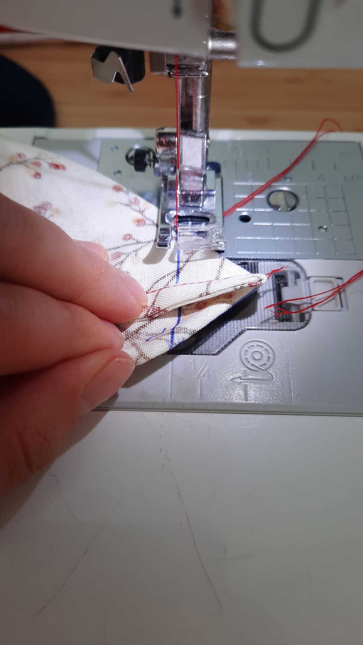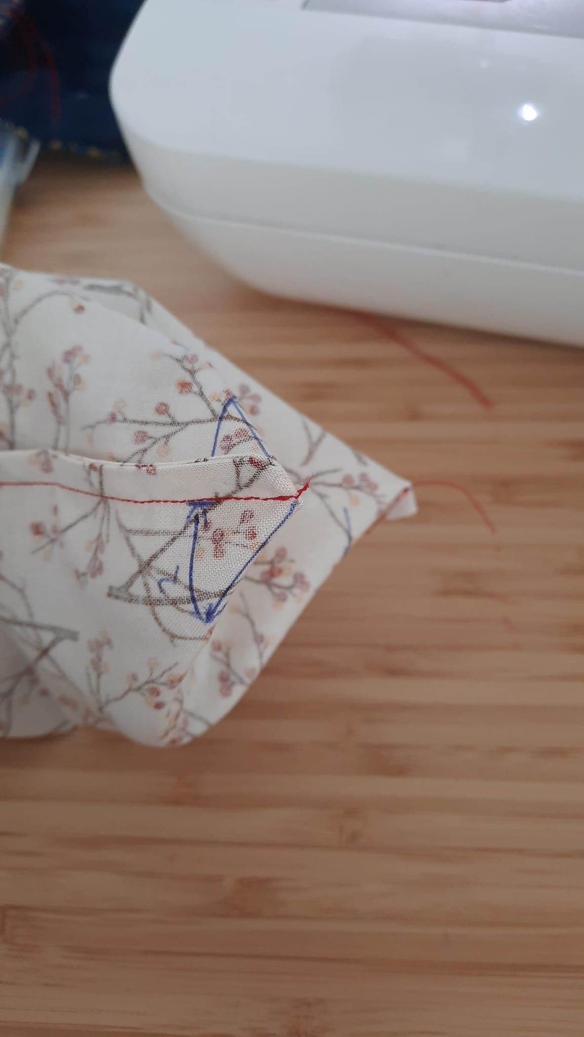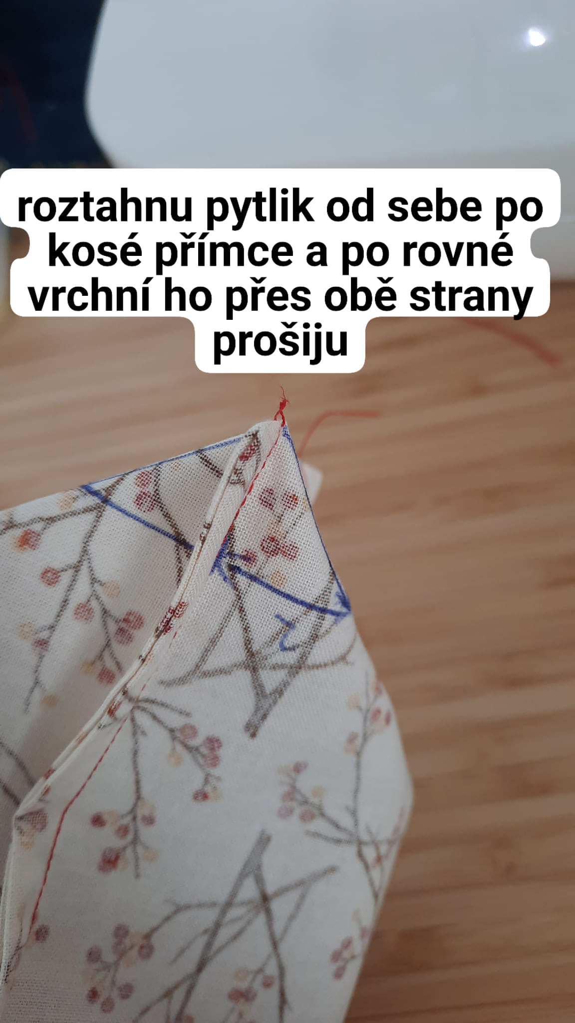 Roztáhnu sáček od sebe a složím jej po kosé lince. Po rovné vrchní linii ho se zapošitím prošiji. Tím vznikne dno.