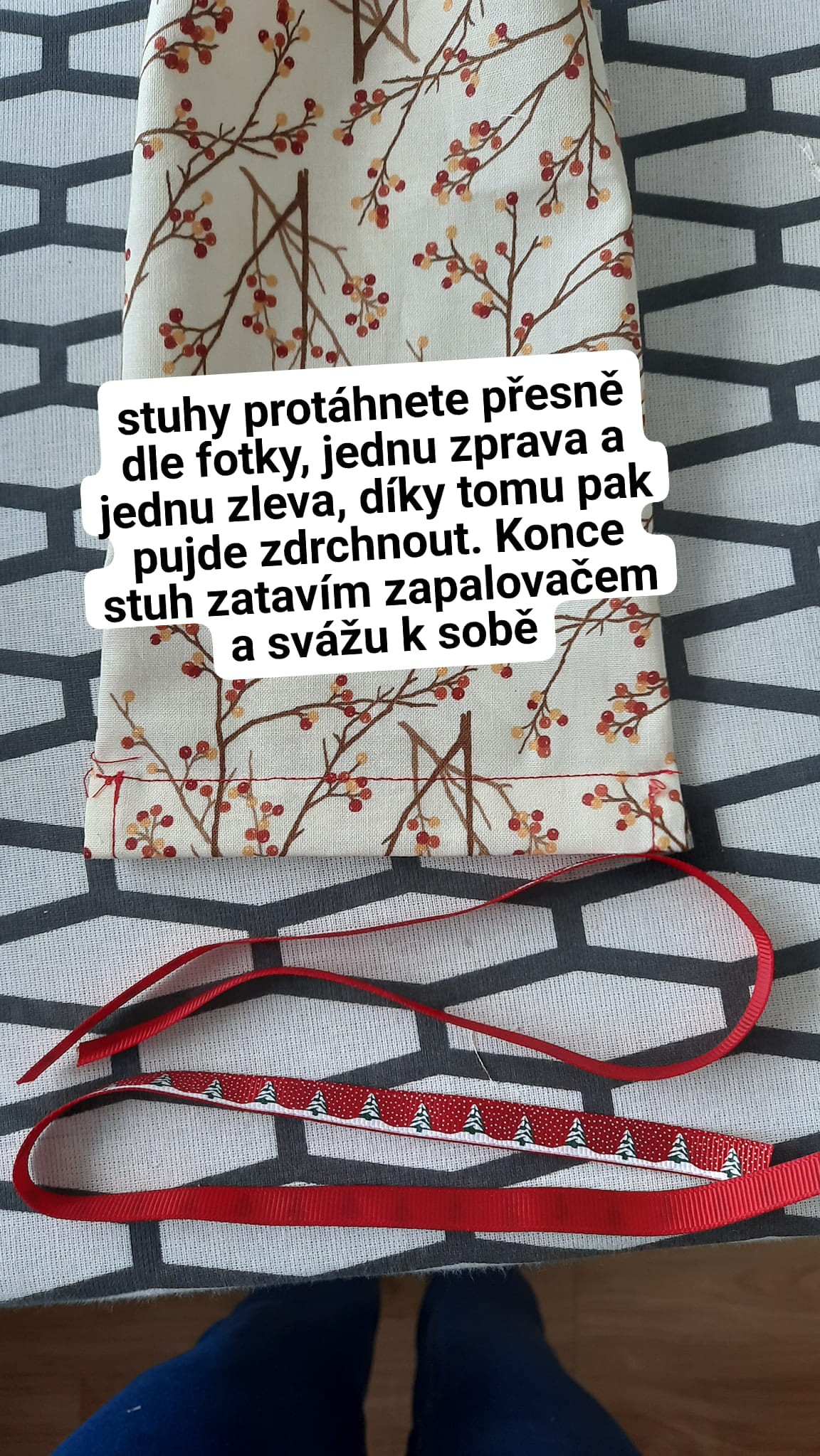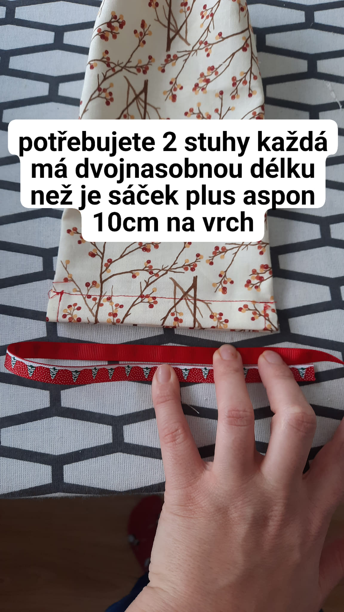 Připravíme si 2 stuhy nebo provázky na stahování. Každá bude dlouhá jako 2x šířka sáčku plus 10 cm navrch.