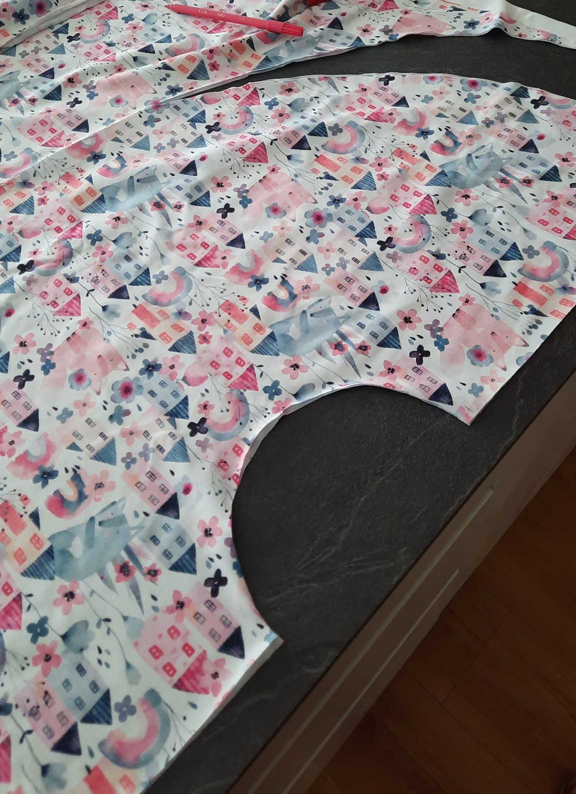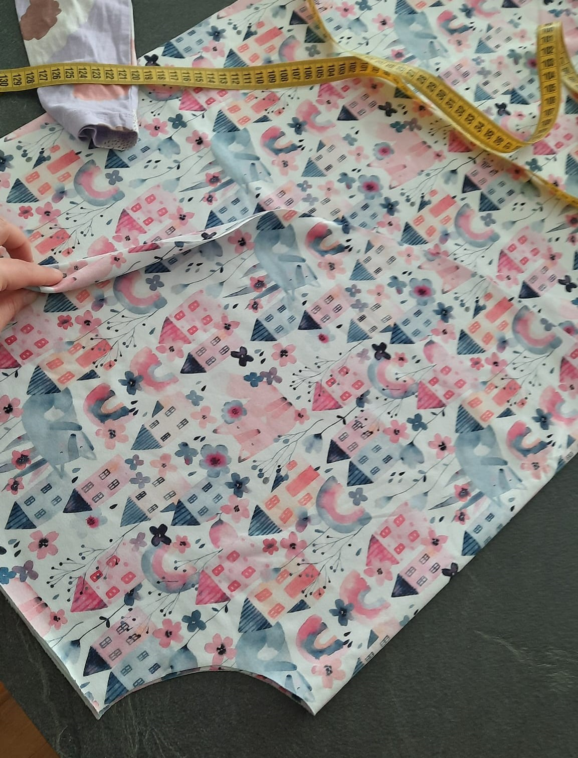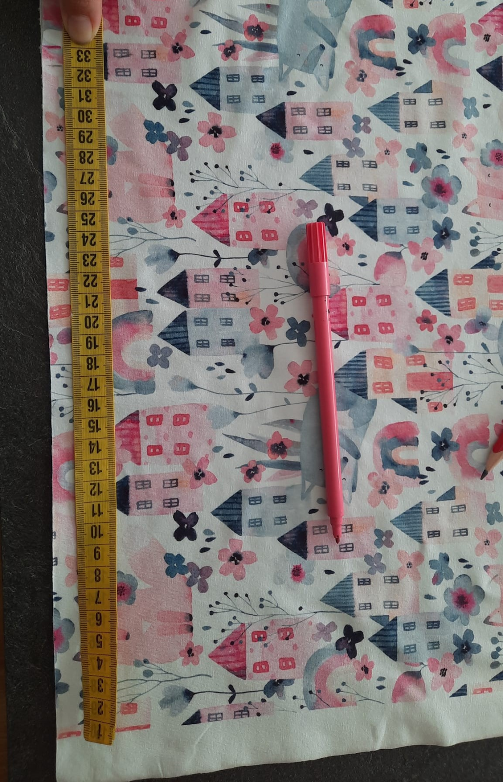 protože mám vzor domečků budu sukni stříhat jako dvě pulkola, jistě najdete na yt či pinterest milion fotek jak na to, zde jen ve zkratce: naměřím od kraje délku sukně 32+1 na šev v pase, na délku nic budu lemovat proužkem. od té značky v 33 cm naměřím hodnotu z wikiny (r - poloměr kruhu) tedy asi 9.5 cm