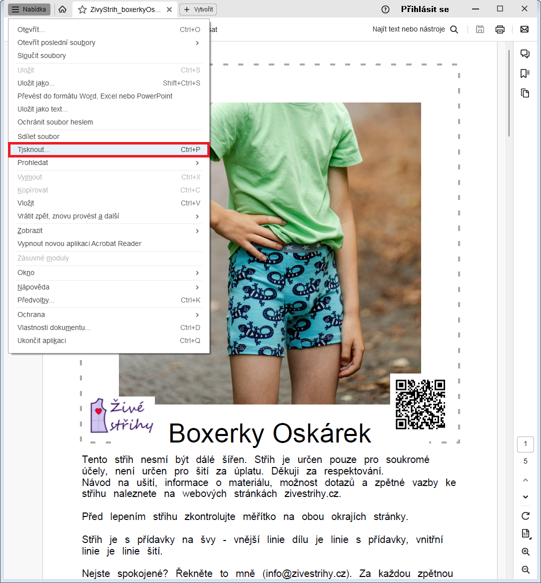 Pokud jste ještě nikdy náš tisk netiskli, je fajn si vytisknout jen jednu stránku (se střihem, tj, např. stránku číslo 3) a ověřit si měřítko. Je škoda vytisknout 30 stránek a pak zjistit, že měřítko nesedí a musíte tisknout znovu.