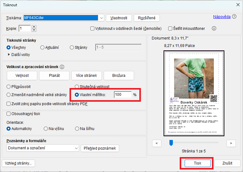V části "Velikosti a zpracování stránek" zvolíte "Vlastní měřítko: 100%" a kliknete na "Tisk". V tomhle případě tisknu celý střih. Pokud chcete tisknout jen testovací stránku, zvolte "Tisknutelné stránky - Stránky: 3".
