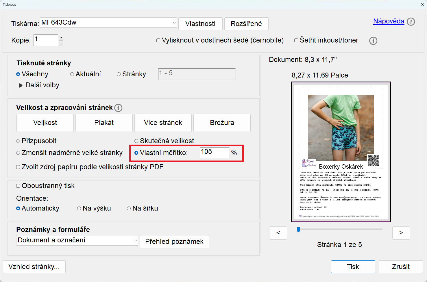 Nastavíme si nový tisk s měřítkem vlastním a nastavíme 105%.