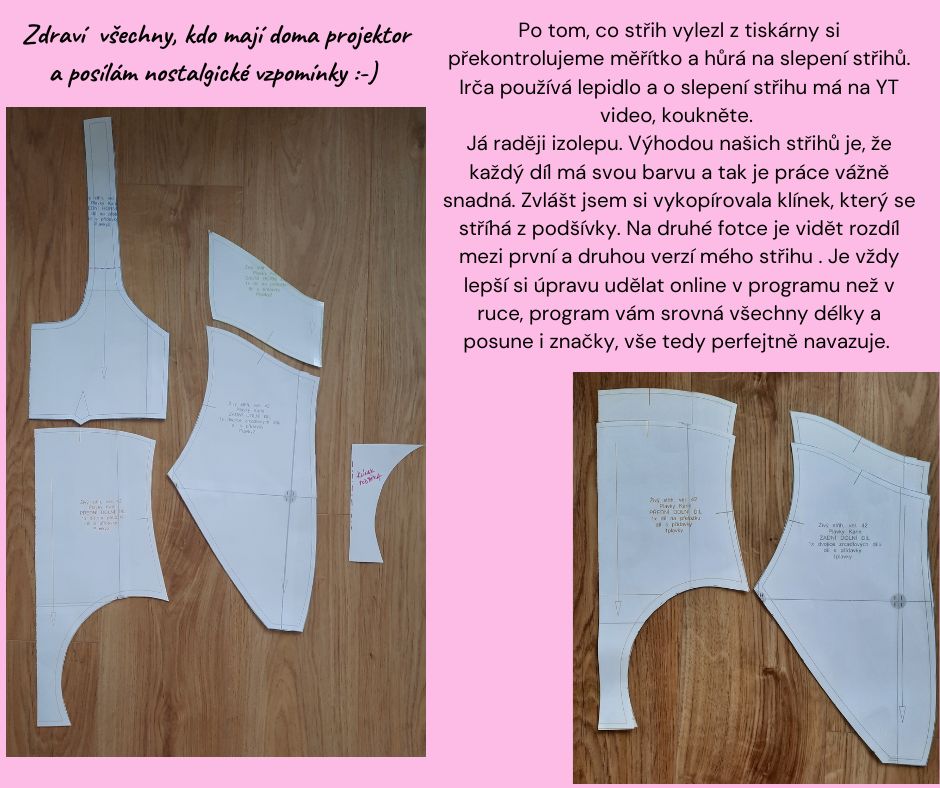 Po tom, co střih vylezl z tiskárny si překontrolujeme měřítko a hůrá na slepení střihů. Irča používá lepidlo a o slepení střihu má na YT video, koukněte.