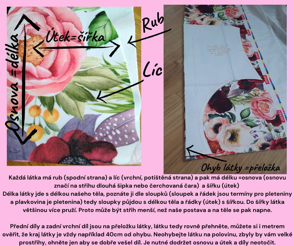 Každá látka má rub (spodní strana) a líc (vrchní, potištěná strana) a pak má délku =osnova (osnovu značí na střihu dlouhá šipka nebo čerchovaná čara) a šířku (útek)