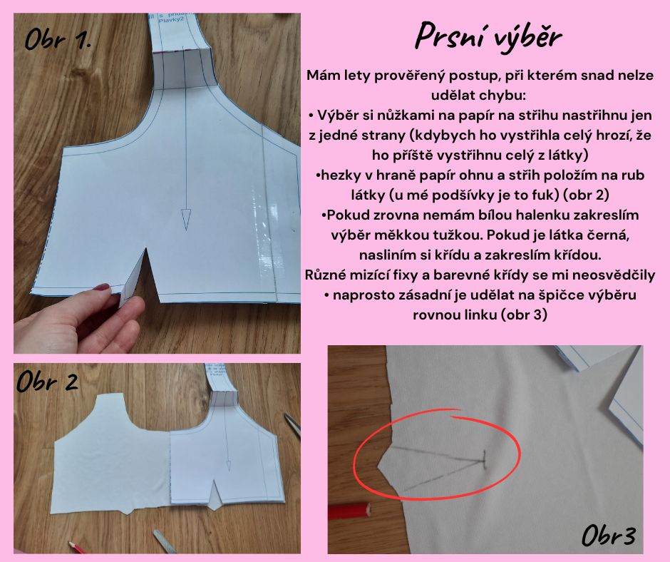 Na vrchním díle je u ramínka značka, kde končí podšívka, není nutné díl znovu kopírovat na papír, stačí ohnout. Na spodním předním díle je opět linka a tento díl jsem si obkreslila (má stejné záložky) Oba díly na ohyb vystřihnu z podšívky (ideální je ta plavková, ale lze použít i bambus, jen pozor prodlouží se doba schnutí)