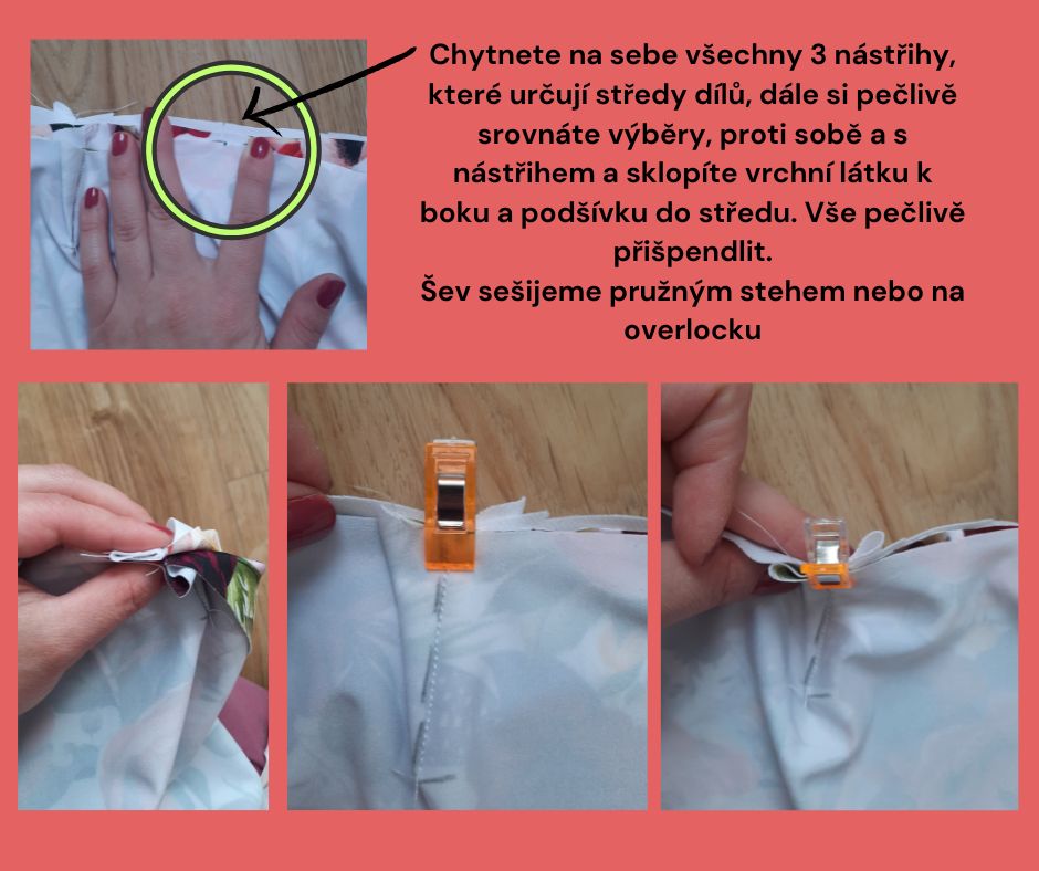 Chytnete na sebe všechny 3 nástřihy, které určují středy dílů, dále si pečlivě srovnáte výběry, proti sobě a s nástřihem a sklopíte vrchní látku k boku a podšívku do středu. Vše pečlivě přišpendlit.