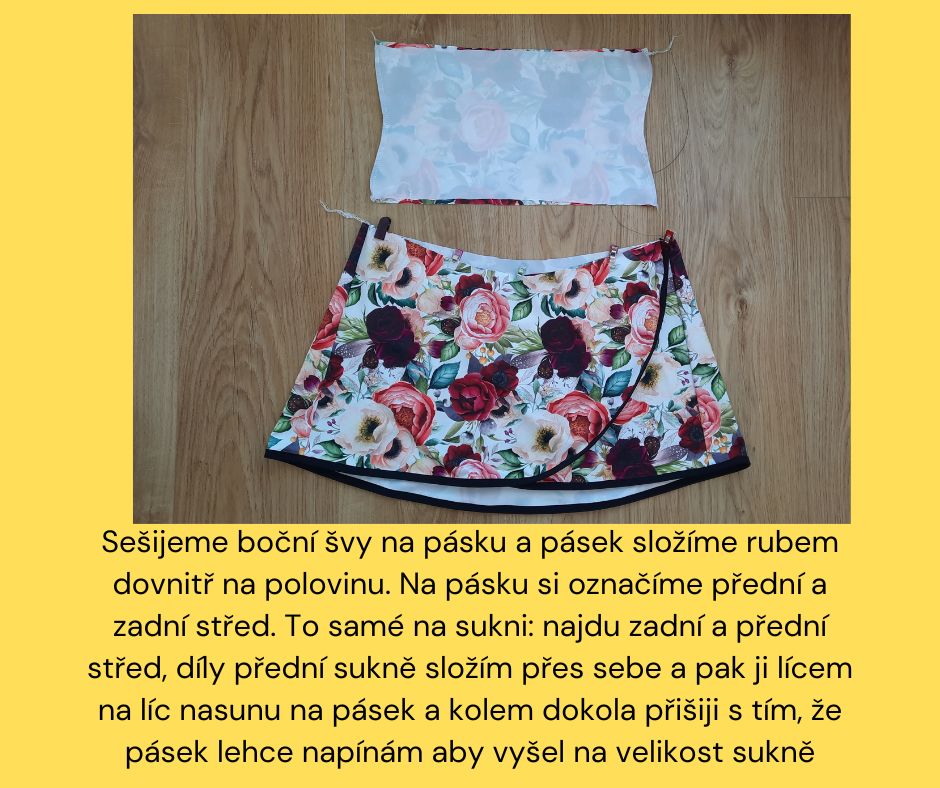 Sešijeme boční švy na pásku a pásek složíme rubem dovnitř na polovinu. Na pásku si označíme přední a zadní střed. To samé na sukni: najdu zadní a přední střed, díly přední sukně složím přes sebe a pak ji lícem na líc nasunu na pásek a kolem dokola přišiji s tím, že pásek lehce napínám aby vyšel na velikost sukně