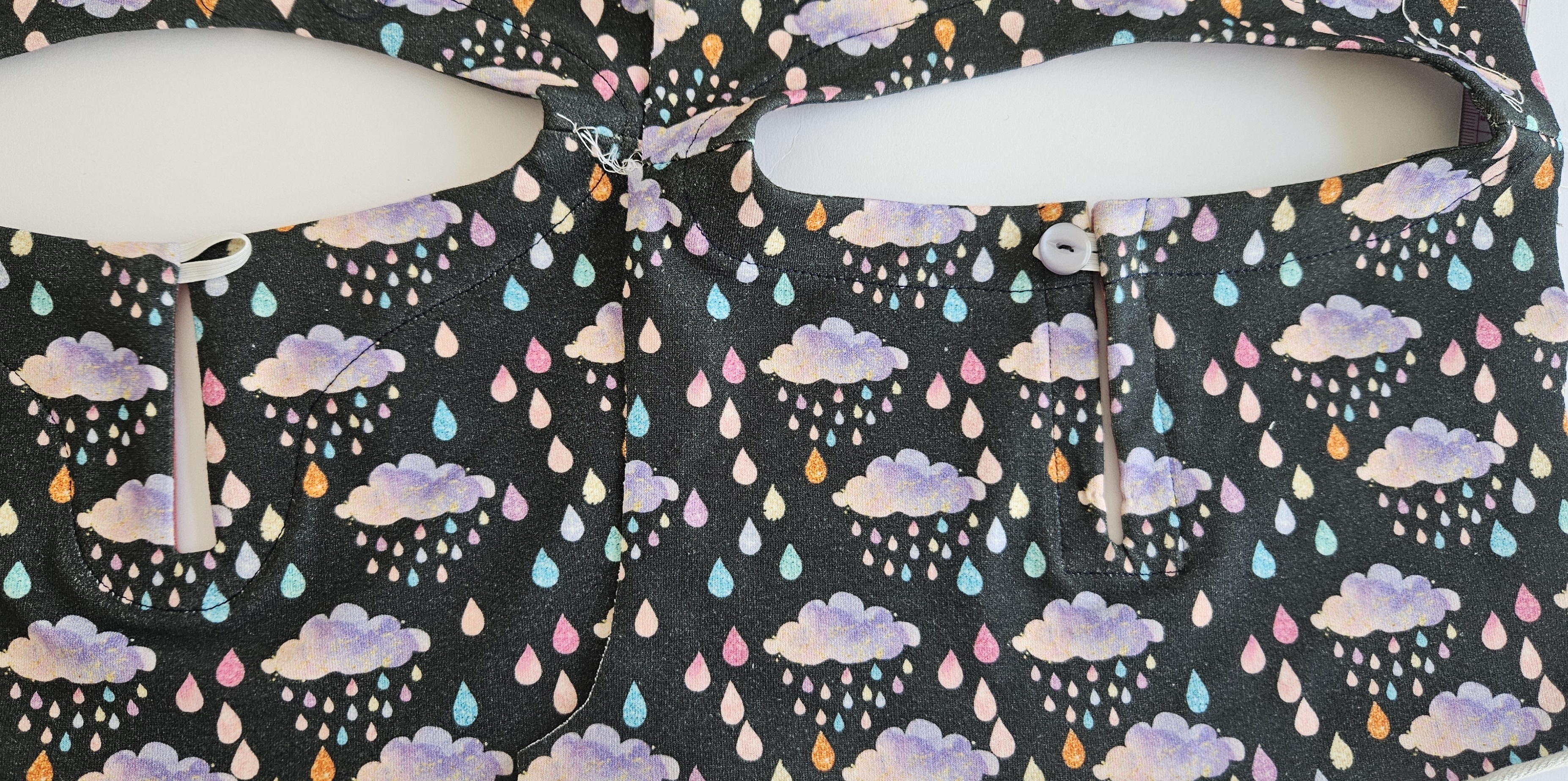Šaty Pavlínka mají lodičkový výstřih, který je začištěný podsádkou. Především u nejmenších velikostí se může stát, že je výstřih více těsný a špatně se obléká přes hlavu.