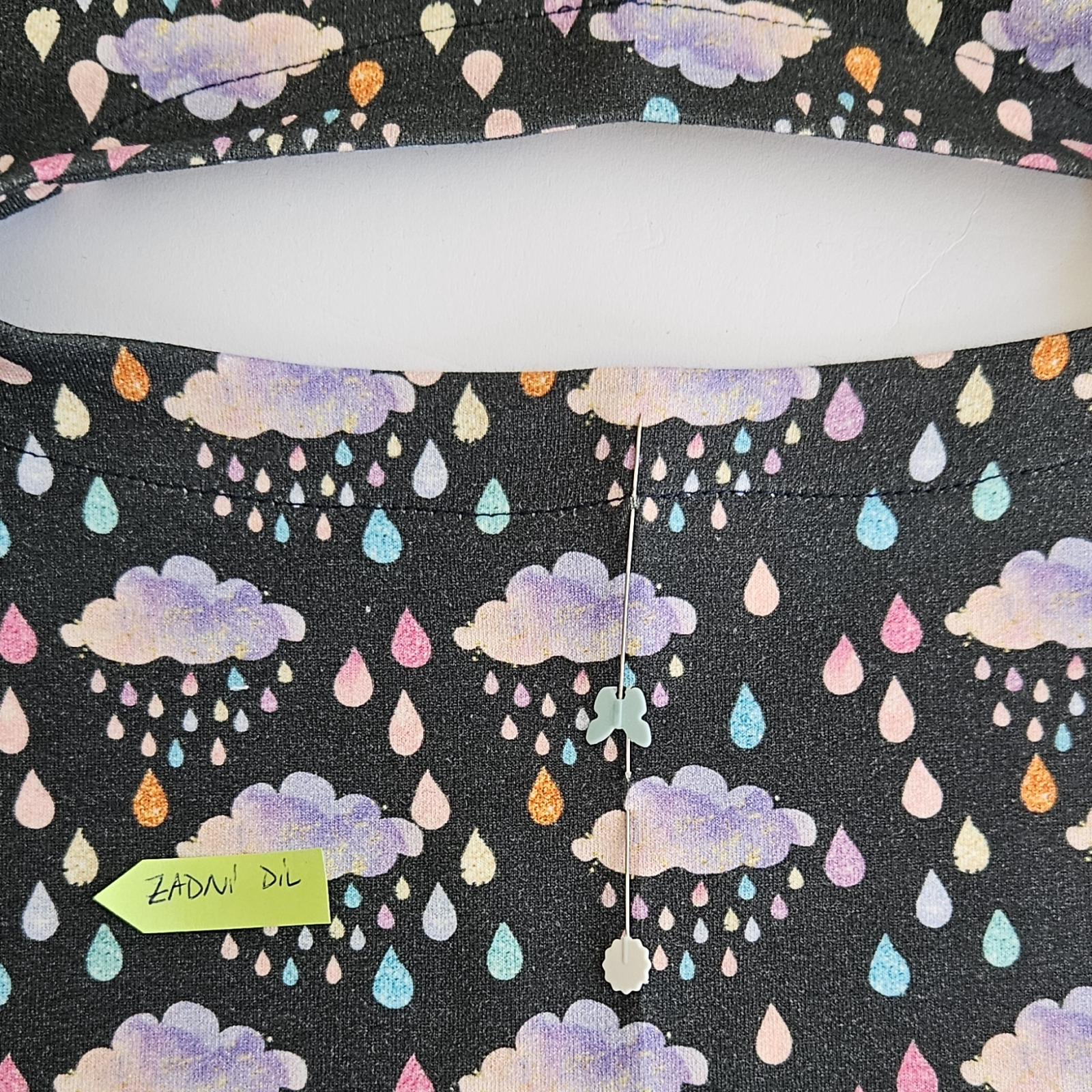 na střed zadního dílu umístím střed podsádky, zbytek kolem dokola našpendlím - ramena na sebe atd.