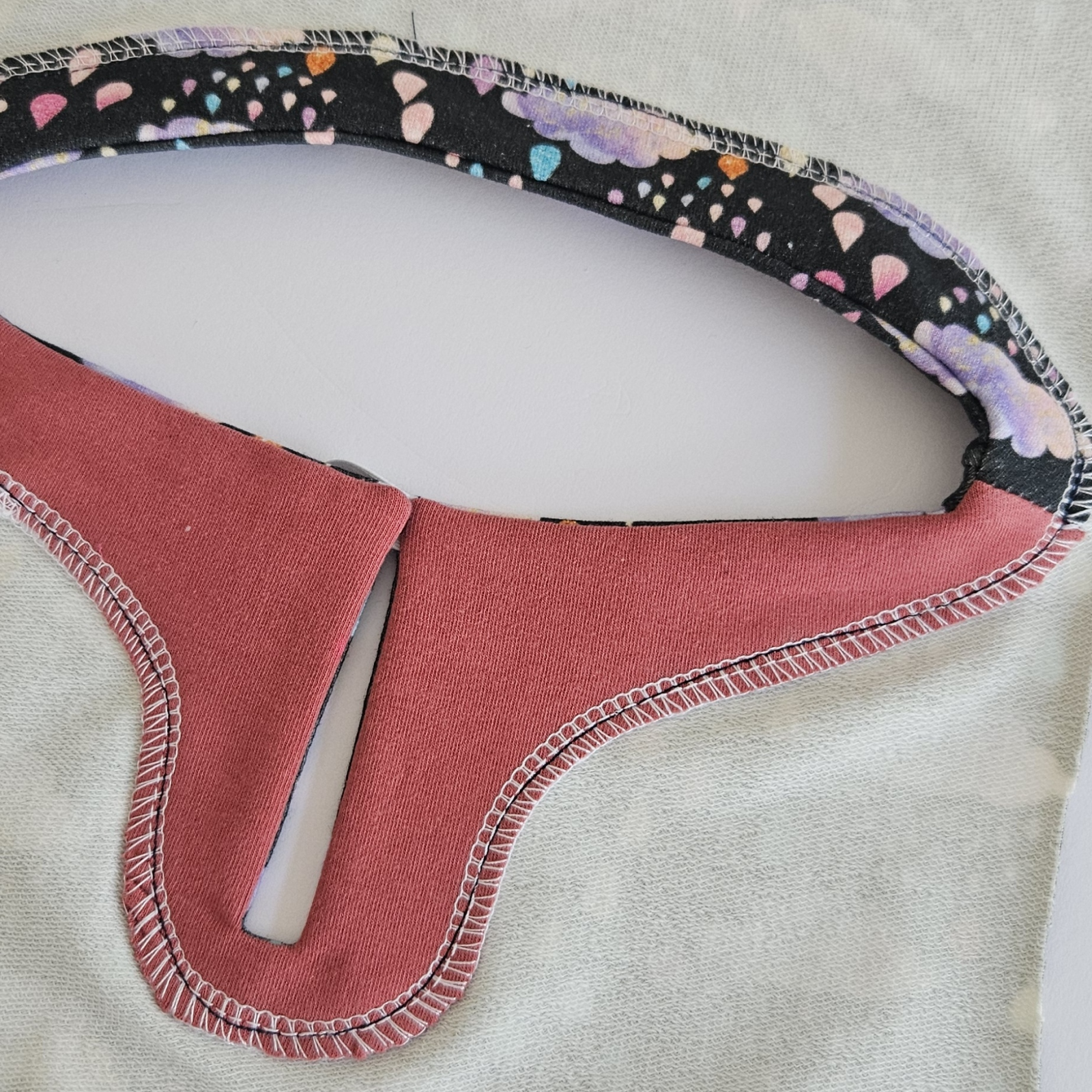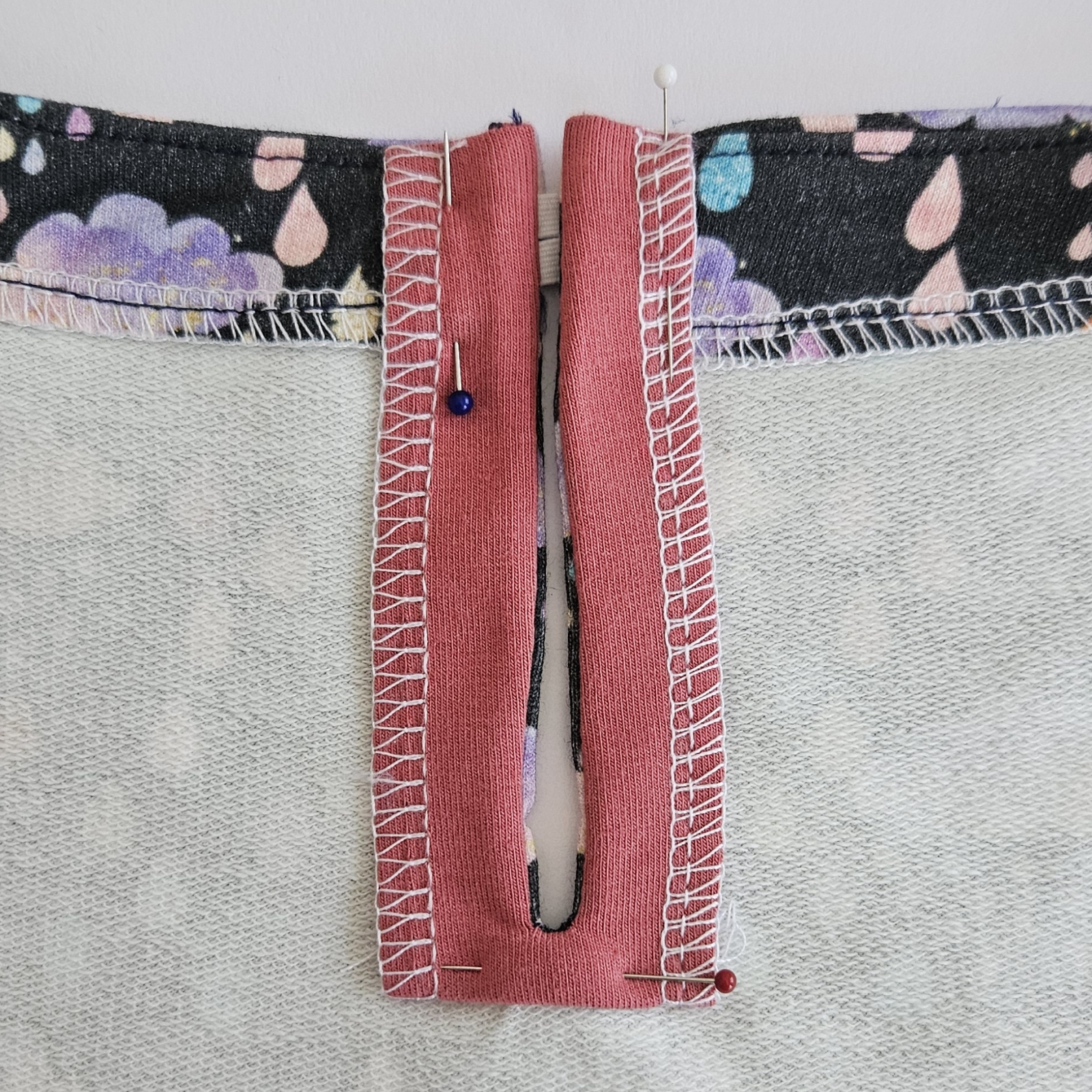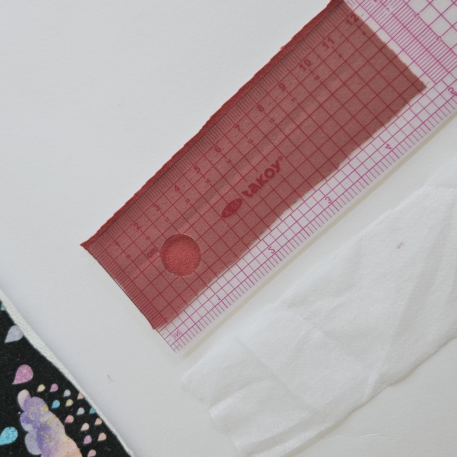 Já zde používám kontrastní látku, Vám doporučuji stejnou barvu úpletu šit slabé teplákoviny. Proužek 4 x 12 cm podlepím vlizelínem