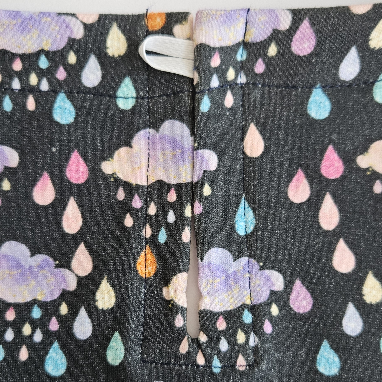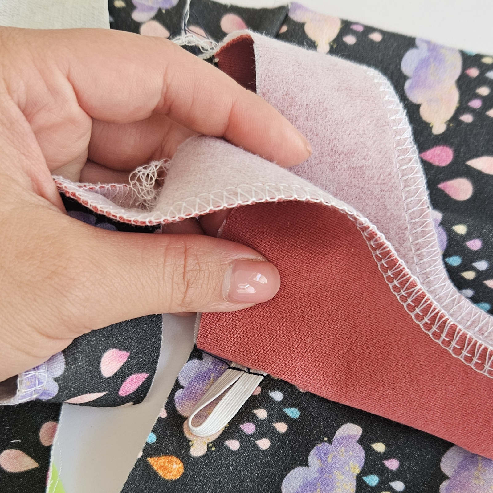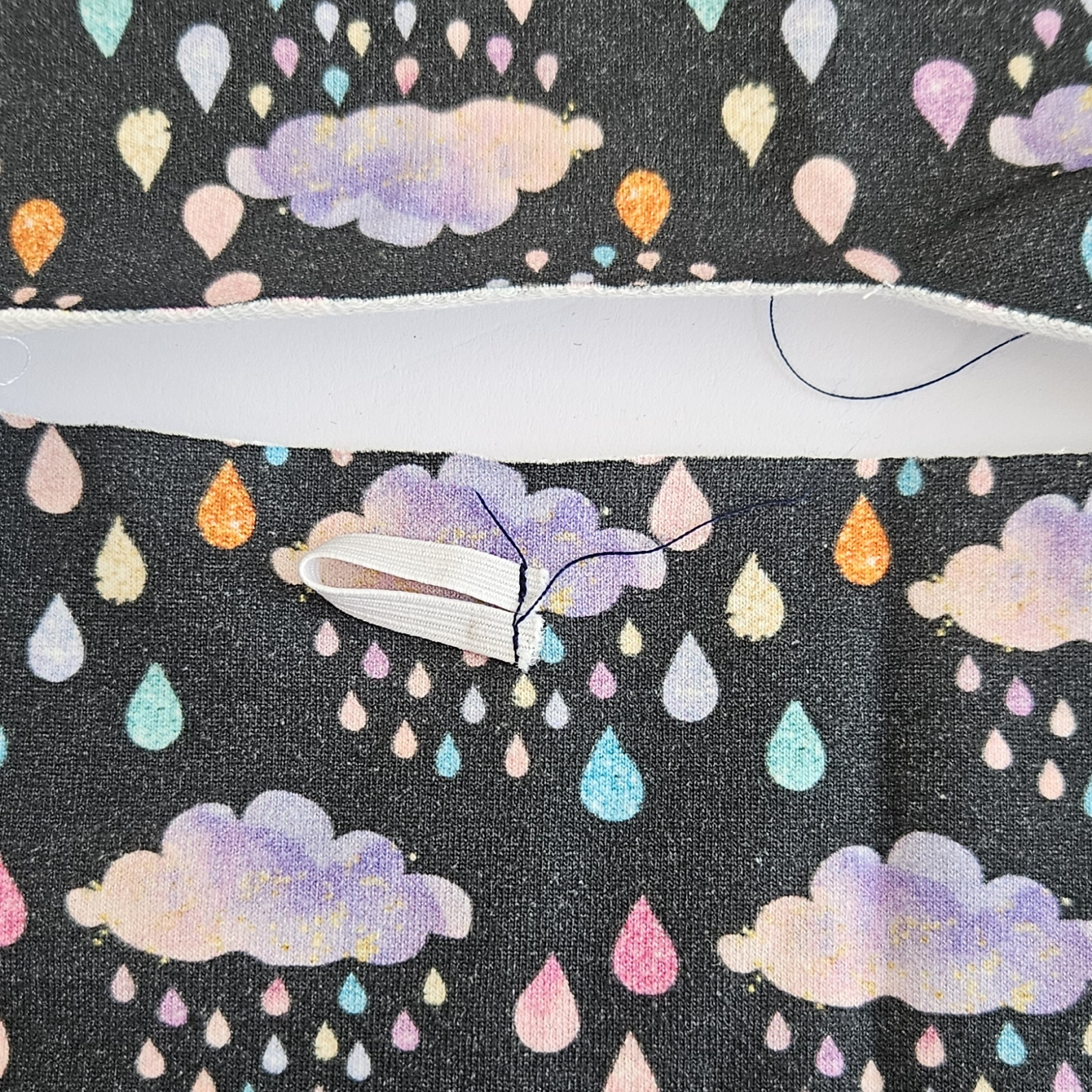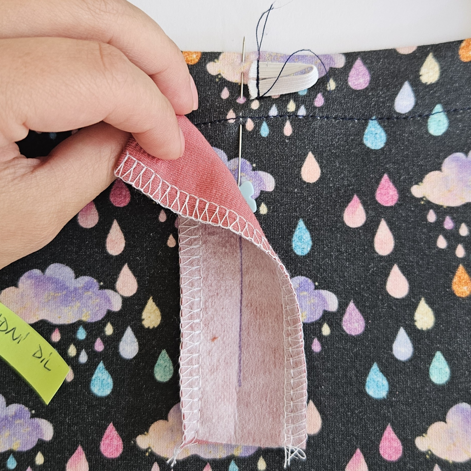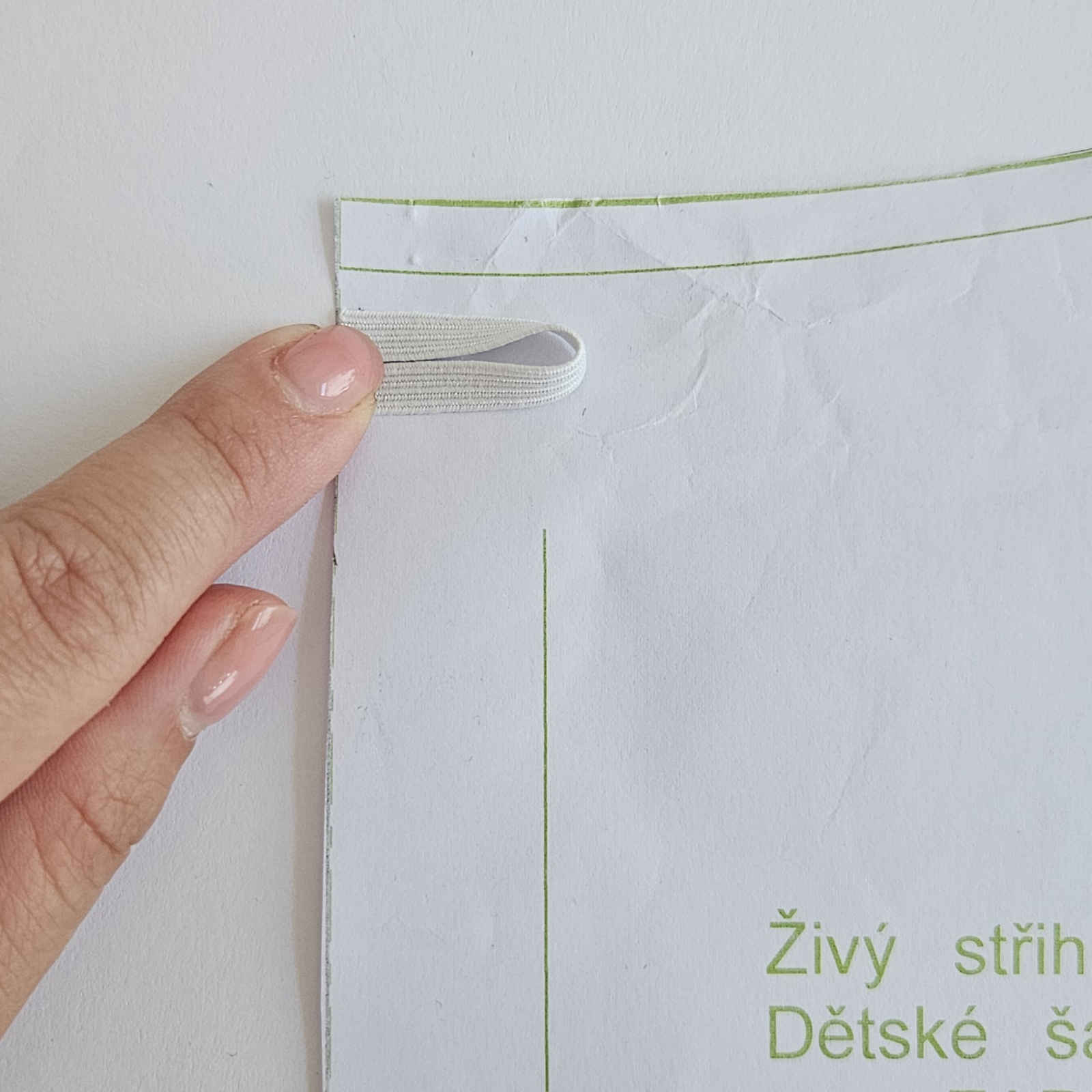 Na střihu si zakreslím umístění gumičky, je asi 1,5 cm od okraje