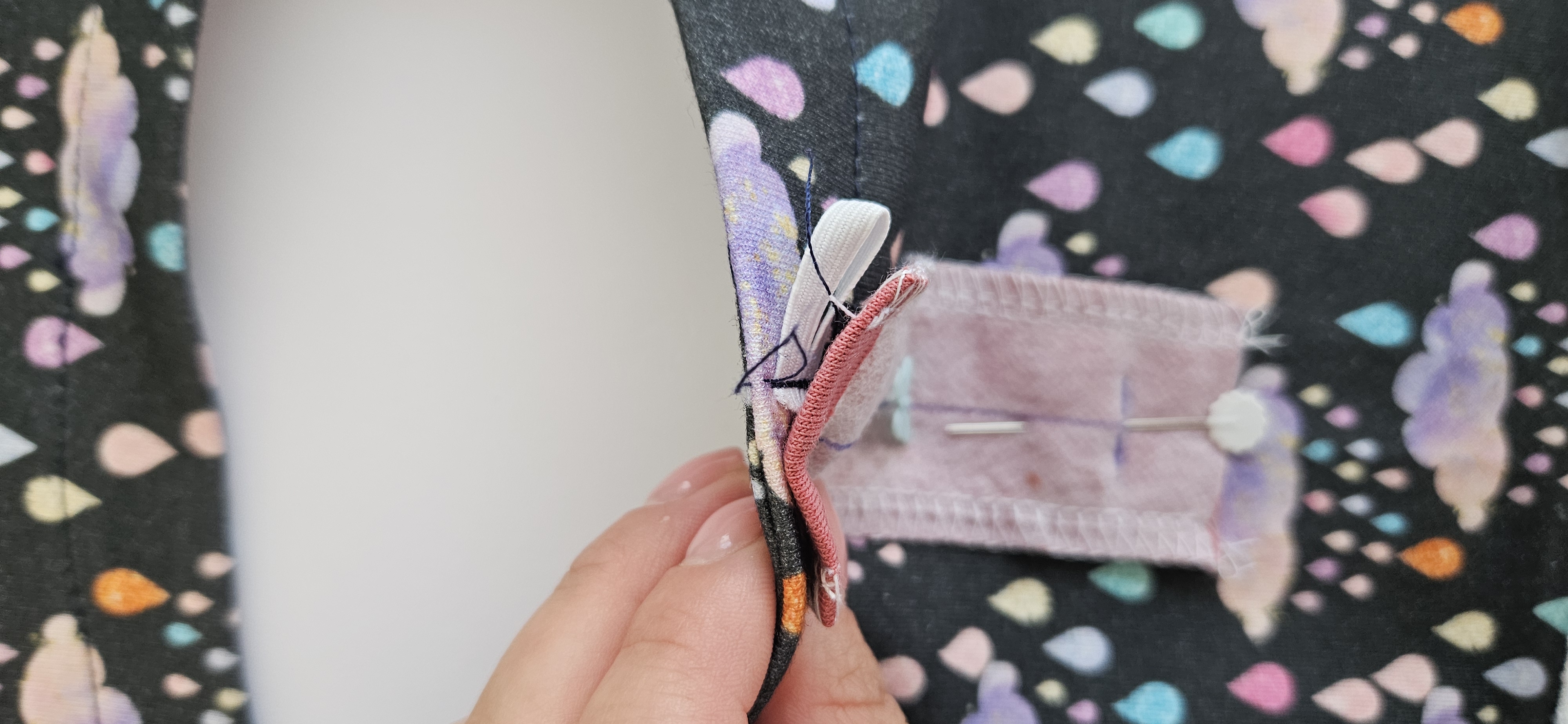 našpendlím a šití povedu tak, abych šila 2mm za zachycenou gumičkou tedy aby šití gumičky bylo uvnitř nového "okýnka"