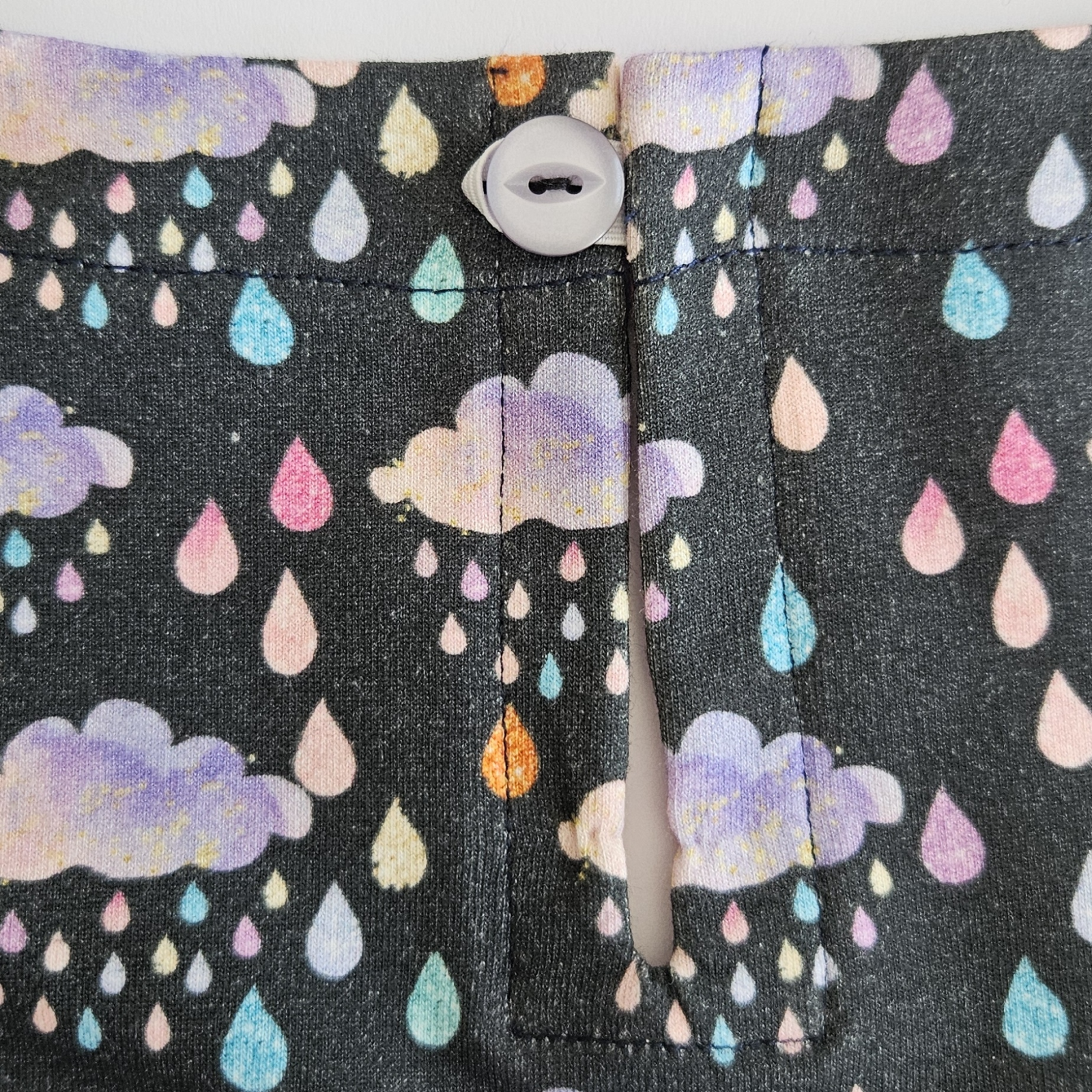 Pohled z líce: Podsádka protažená je prišitá obloukem. Obě verze počítájí s knoflíčkem a gumičkou na zapnutí.