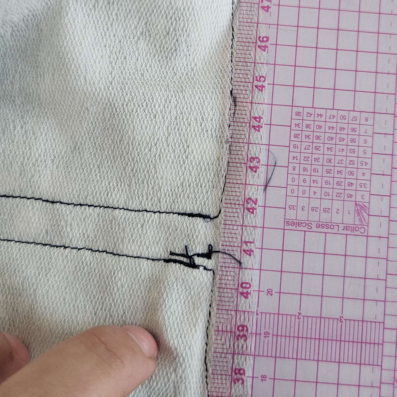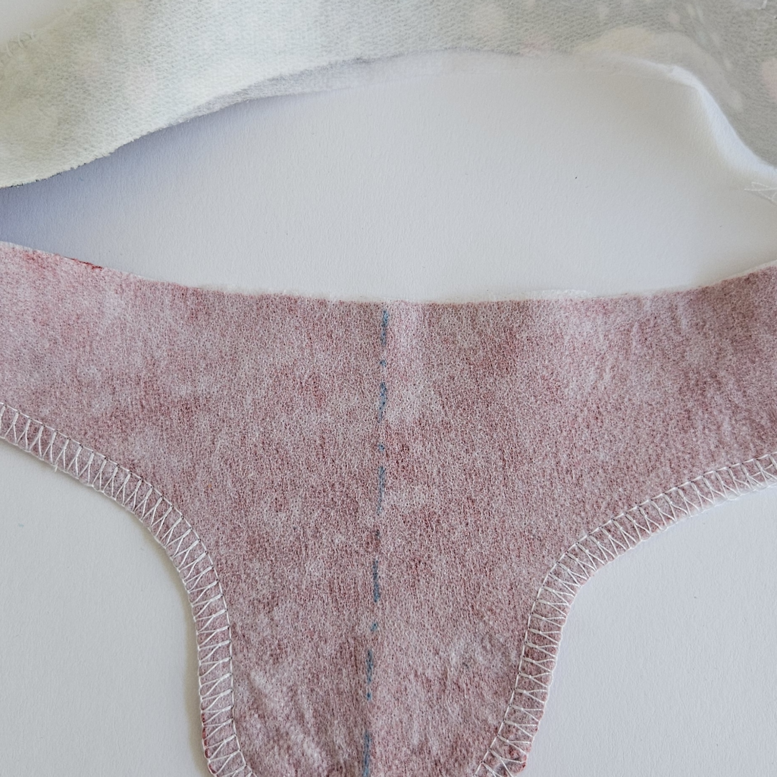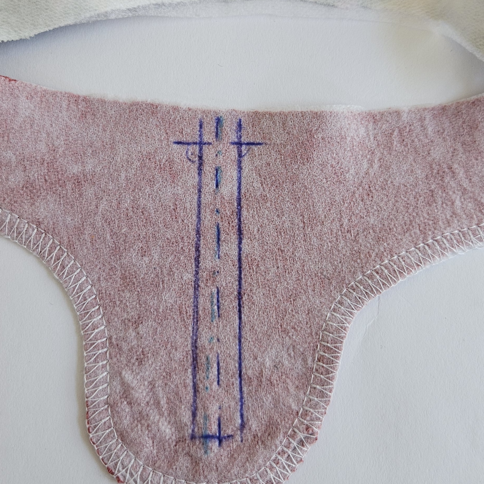 na podsádce si zakreslím střed a hloubku šití, plus je nutné mít zakreslený vrchní kraj který je v rovině, aby mi po přišití vyšly obě strany stejně vysoké a nebyl tam zub