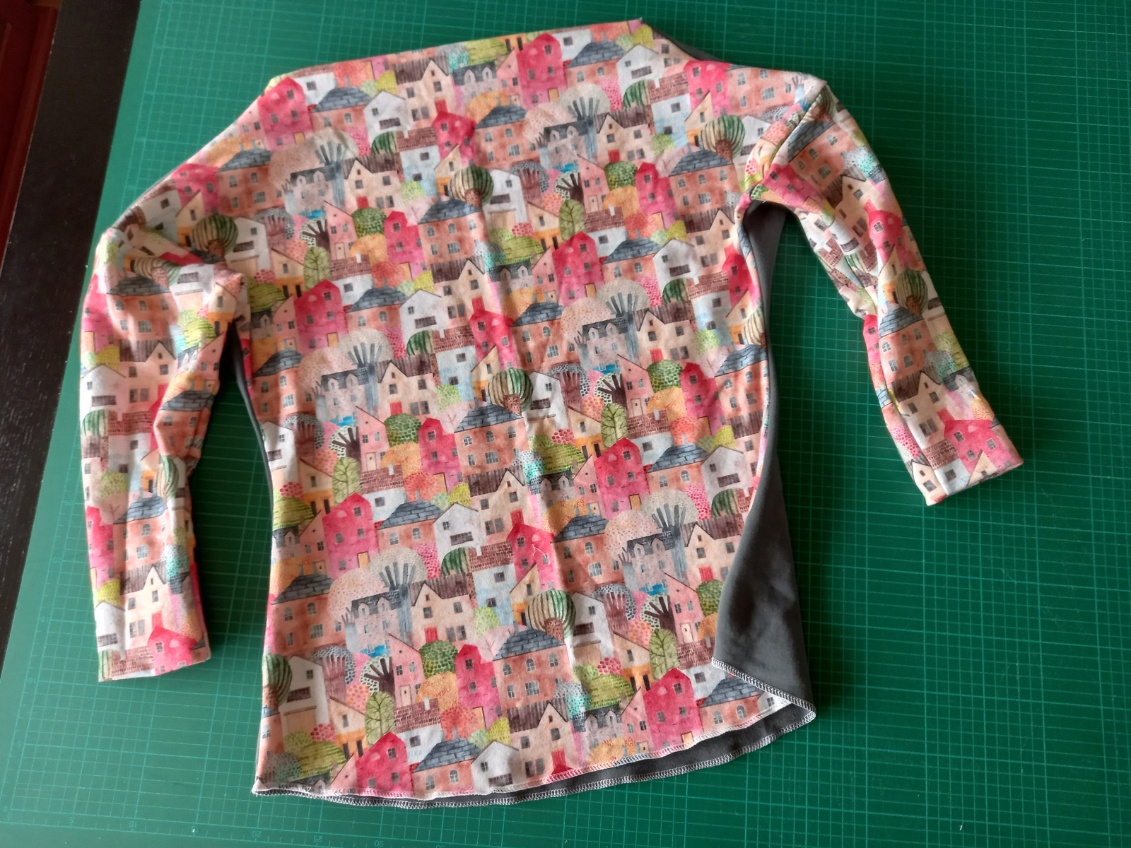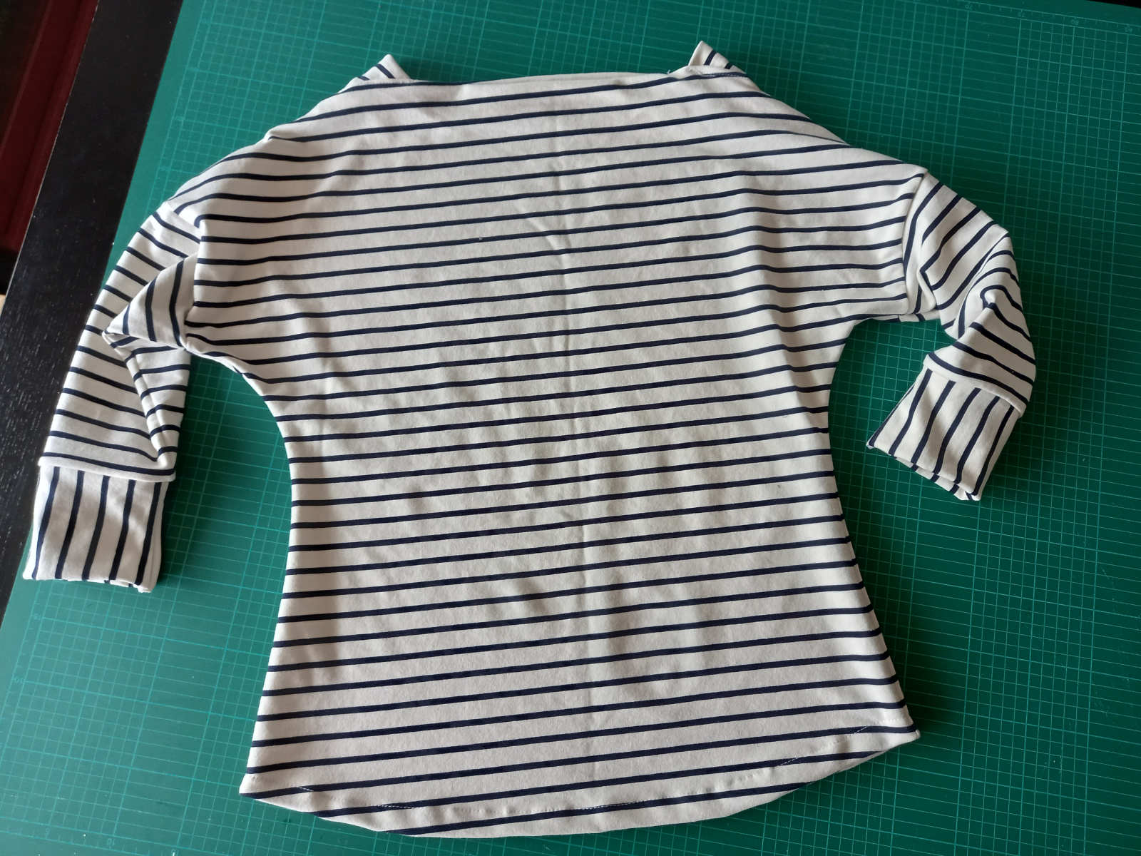 KH „Střih je pro začátečníky je určitě skvělý. Zkusila jsem mikinu rovnou dvakrát. V pase i na bocích sedí pěkně. Délka mi také vyhovuje, ale přiznám se, že výstřih zkusím pozměnit, nevyhovuje mi, že hodně dosedá na krk. Také je rovně až u rukávů, proto jsem u pruhované verze zkusila přidat klínky u ramen.“