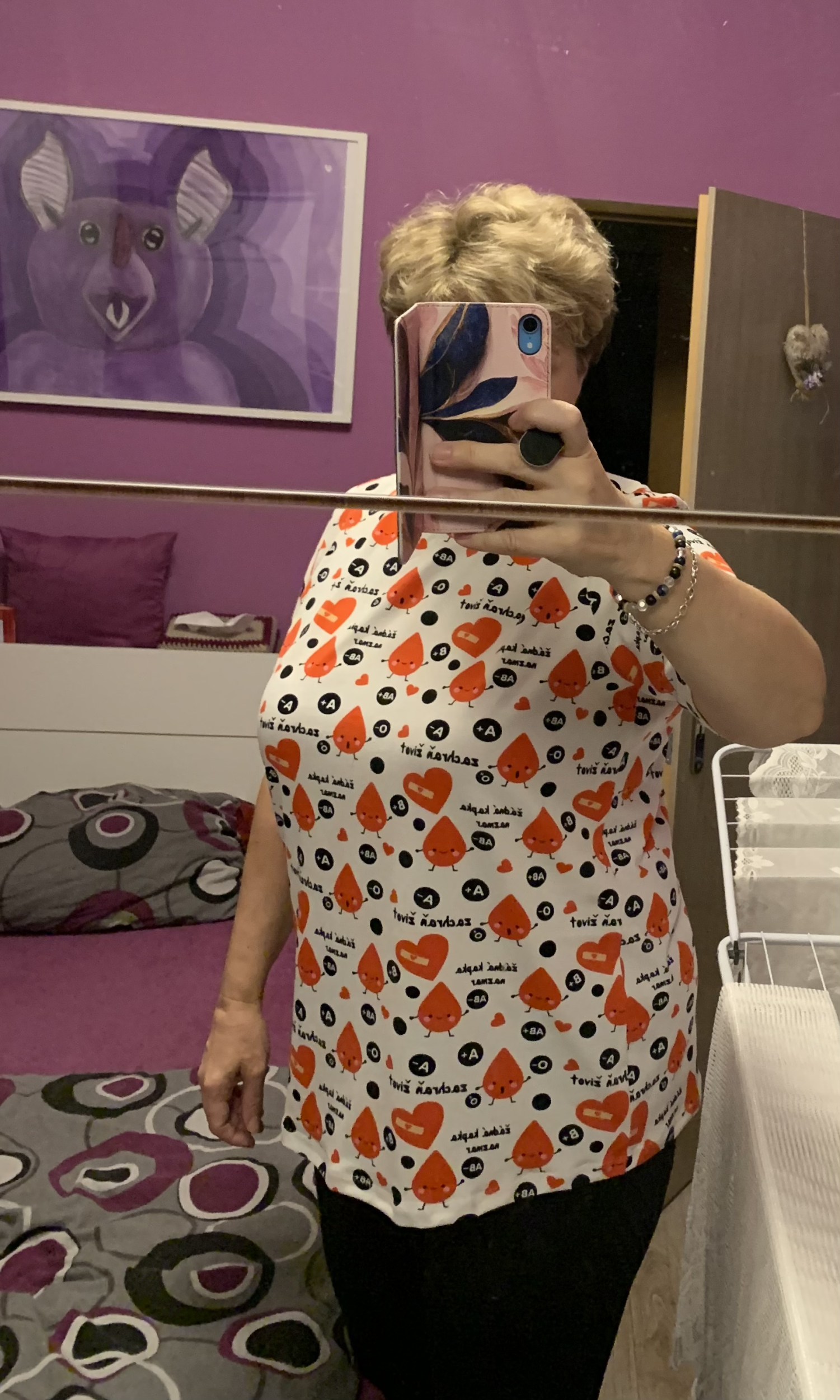 Alena „Šilo se dobře, jen ta bavlna se po vyprání příšerně roluje 😂 Trika budou dvě, pro kamarádku je to překvapeni, obě jsme hezky narostlé, jen ona má menší prsa, tak jsem vynechala prsní záševek, aby jí to netrčelo, a udělala volnější linii kolem pasu a boků“