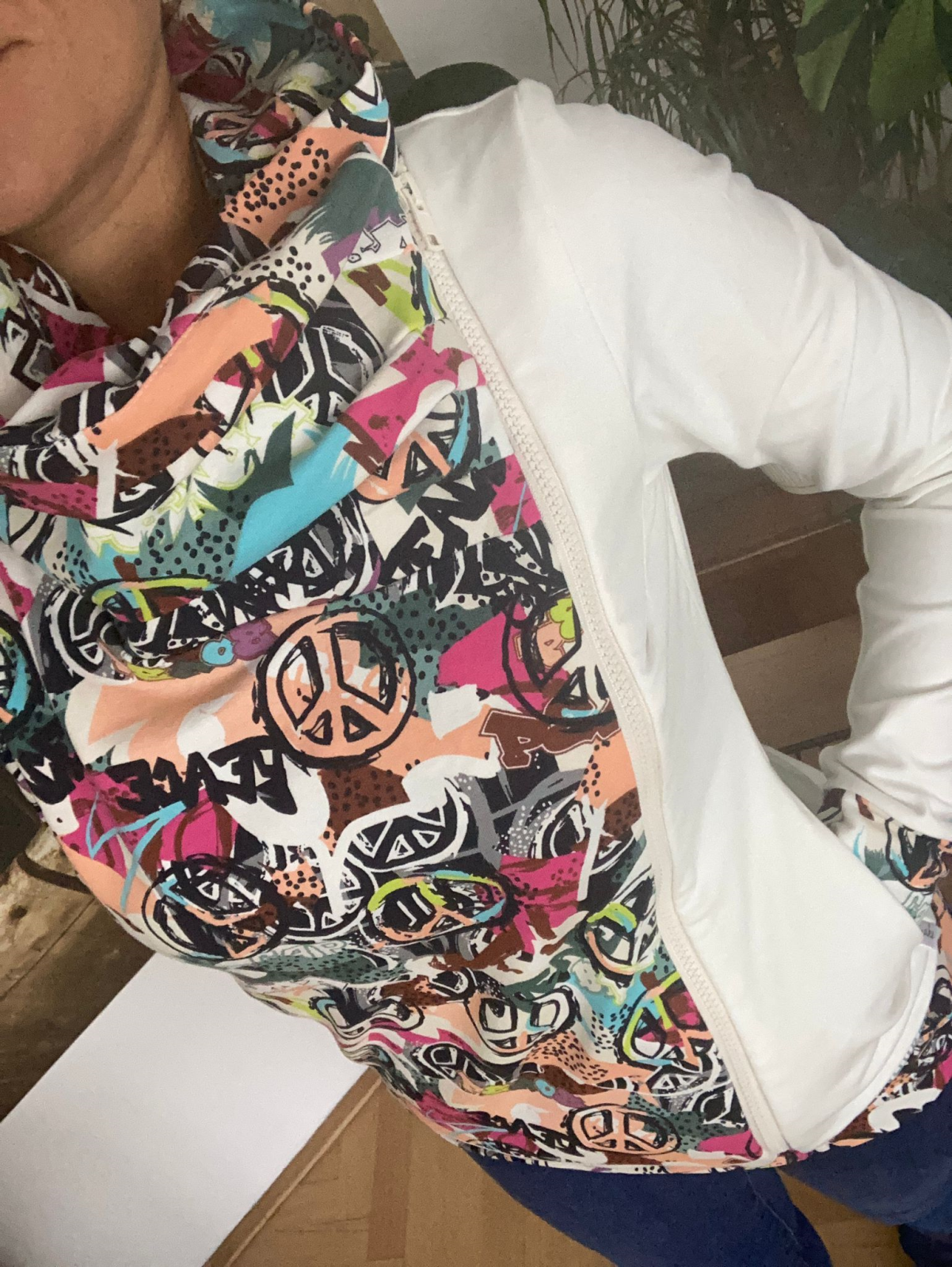 Ušila Mako „Návod je moc příjemný, ale já i úplet začišťuji na overlocku a tyto kroky mi chyběly. Bohužel mi k sobě neseděly (po přišití jedné poloviny) strany zipu, a proto je dole na mikině dodělaný ten šikmý bílý pruh. Neseděly mi k sobě ani obvod límce a mikiny, ale po kontrole jsem rozdíl mezi střihem a nastříhanými díly nenašla. Vzhledem k tomu, že nikdo podobné problémy neuvádí, bude chybka asi u mě :) Jinak mikina vypadá skvěle a když jí mám na sobě sklízím hodně chvály :)“