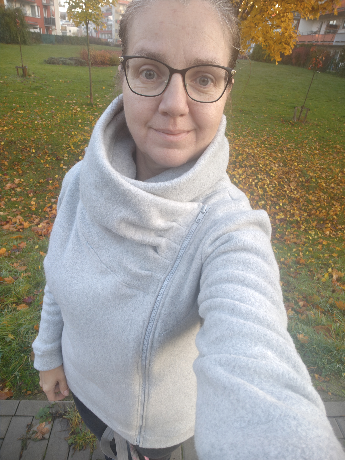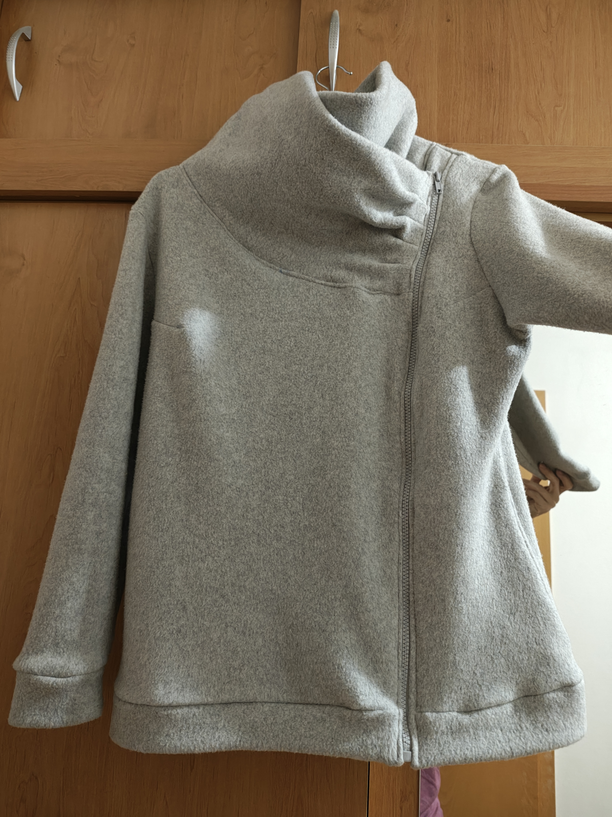 LL „Všechno krásně sedí. V jednom místečku jsem nedokázala procpat všechny vrsvy k prostepovani pod patku, takže cca 1cm jsem prostě vynechala a začala až tam, ale ničemu to nevadí. Vzhledem k tloušťce materiálu jsem počítala, že se to stát může (všechny vrstvy límce vystužené vlizelínem). Střih i návod jsou super. Místo nápletů jsem využila na vše hlavní látku - stačilo mi na celou mikinu 2m přesně. Pár věcí u kterých jsem trochu narazila: 1) pokud by nebyla látka oboulícní, je třeba dát si pozor aby posádky byly při stříhání správně (hodně pomůže video kouknout se na pasáž kde je ukázané které části se podžehlují vlizelínovým proužkem) 2) přišití zipu k levému přednímu dílu bylo složitější kvůli odšitému prsnímu záševku, příště bych zkusila asi raději nejprve našít zip a pak teprve odšít záševek 3) nepotkaly se mi všechny značky při sešívání límce k mikině - pravděpodobně jsem si je na jednom z dílů zaznačila špatně zrcadlově - nevím .... Všívala jsem proto na slepo jak to vycházelo,ale naštěstí si to sedlo dobře. “