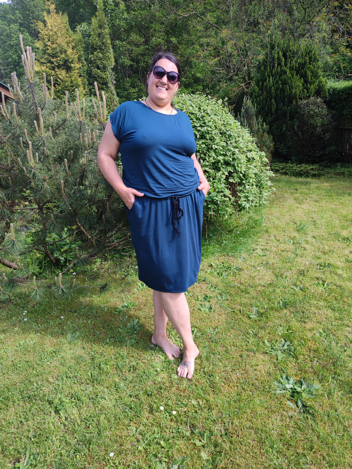 Zdeňka B „Zkusila jsem si je ušít v největší velikosti (48), nevěděla jsem, jestli mi bude střih slušet. Jsem moc spokojená, cítím se v nich dobře. Vřele doporučuji. Rukávy jsem nešila, jen jsem šaty založila, živůtek i sukni jsem si prodlužovala (měřím 174cm), výstřih prohloubila kvůli kojení. Objednala jsem si málo látky, jen 140 cm, tak mi nevyzbylo na kapsy.“
