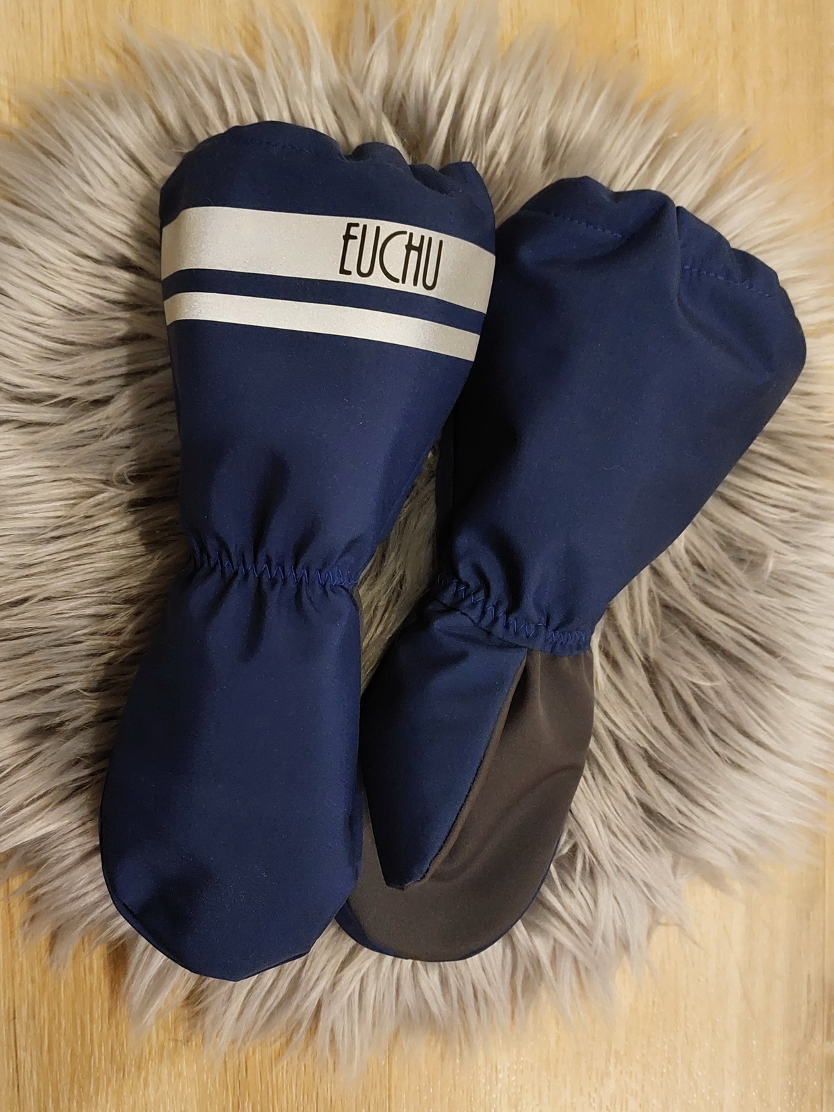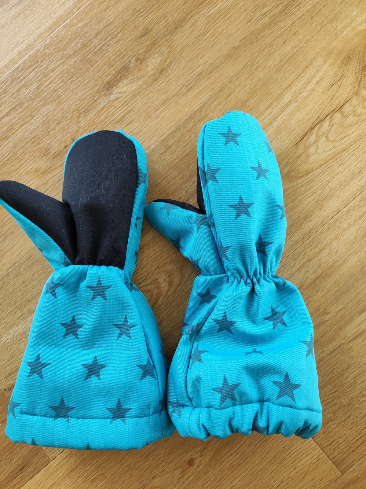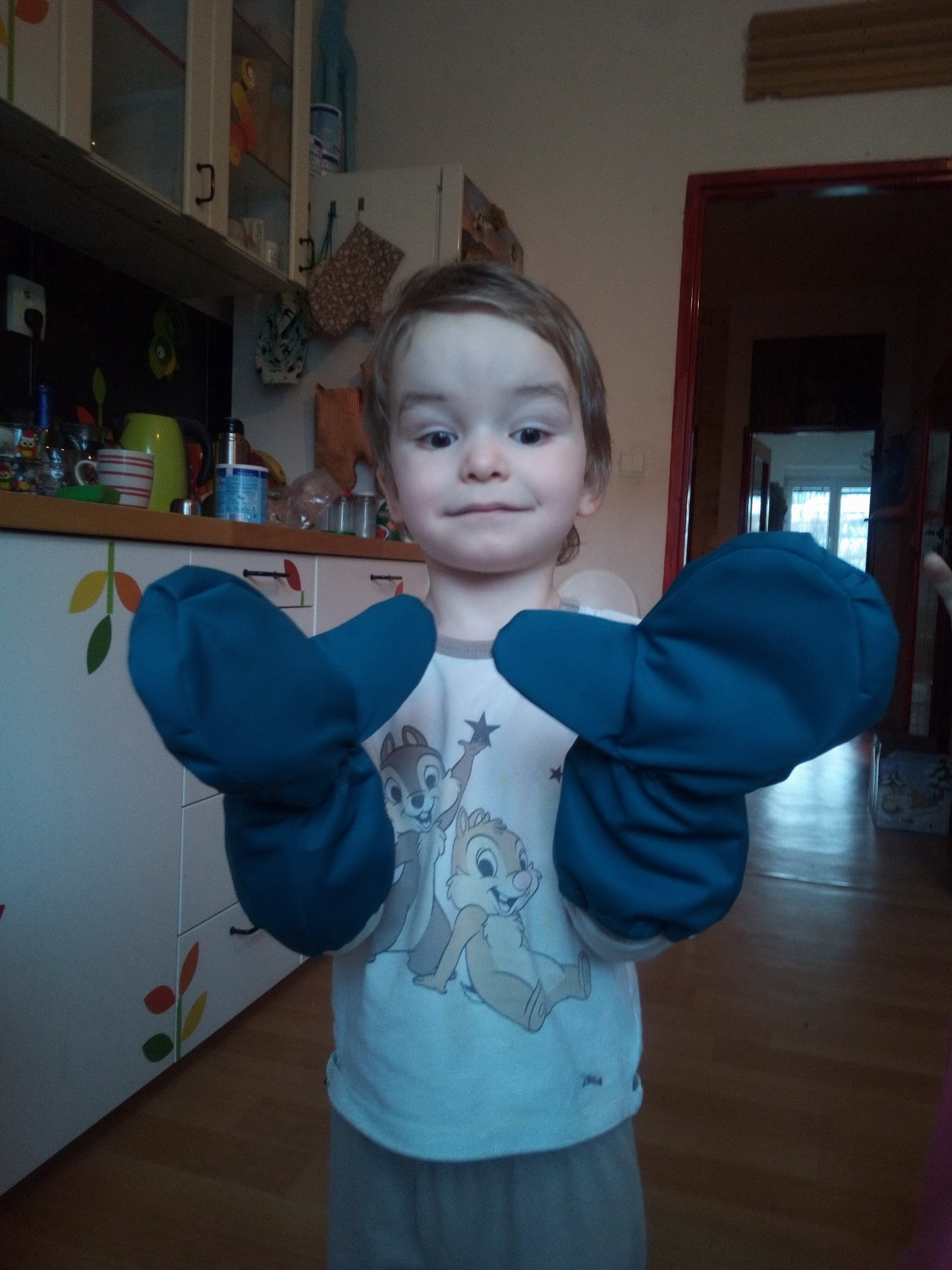 „Tohle jsou už asi páté, mám pocit, že už jsem je fakt vychytala. Tyhle jsou dokonce i krásně ušité 0:) Kombinace materilů je fajn, měla jsem strach, jestli to nebude moc trčet nebo něco a ono ne. A opět sedí jako prdel na hrnec a synovec "má konečně pořádné rukavice". Nasadí mu je i tatínek :) ke všeobecné spokojenosti.“