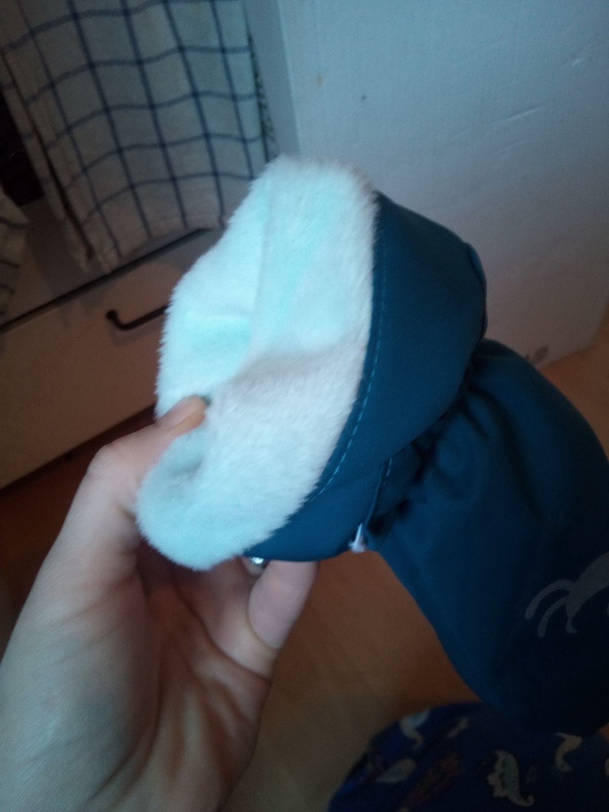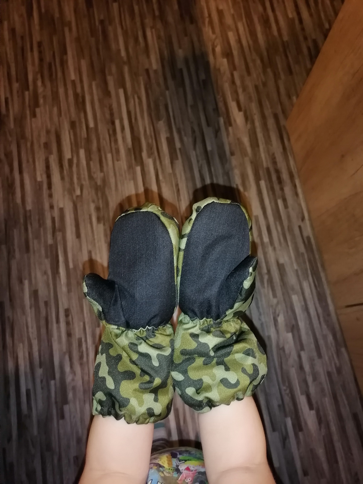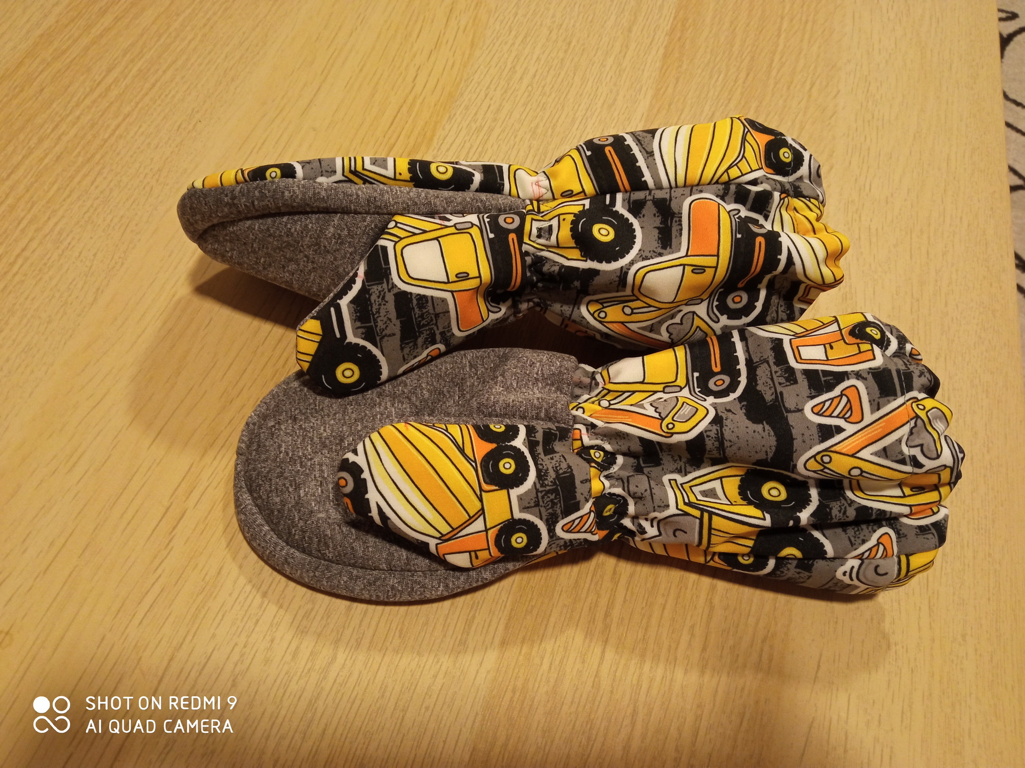 „Tohle jsou už asi páté, mám pocit, že už jsem je fakt vychytala. Tyhle jsou dokonce i krásně ušité 0:) Kombinace materilů je fajn, měla jsem strach, jestli to nebude moc trčet nebo něco a ono ne. A opět sedí jako prdel na hrnec a synovec "má konečně pořádné rukavice". Nasadí mu je i tatínek :) ke všeobecné spokojenosti.“