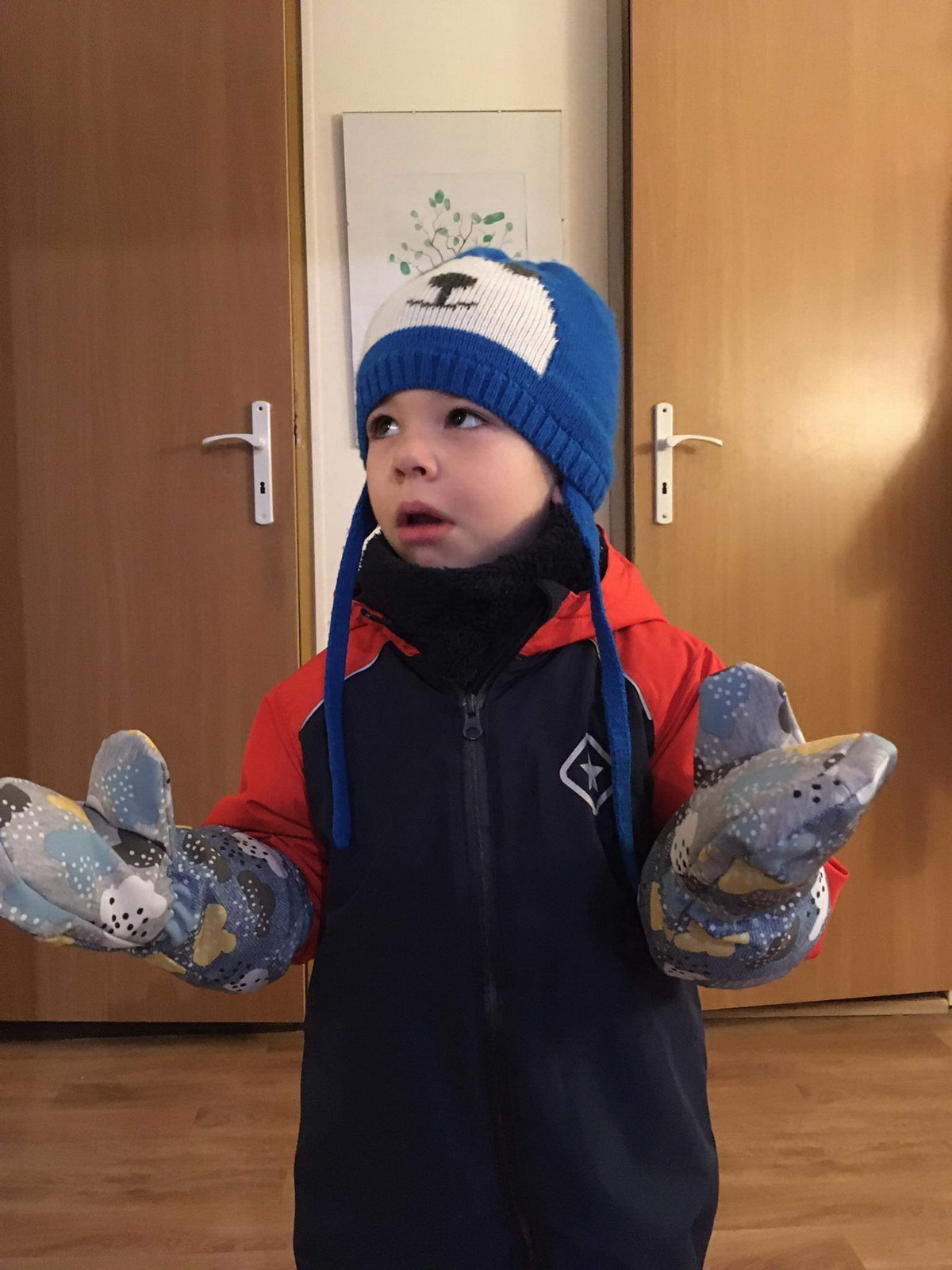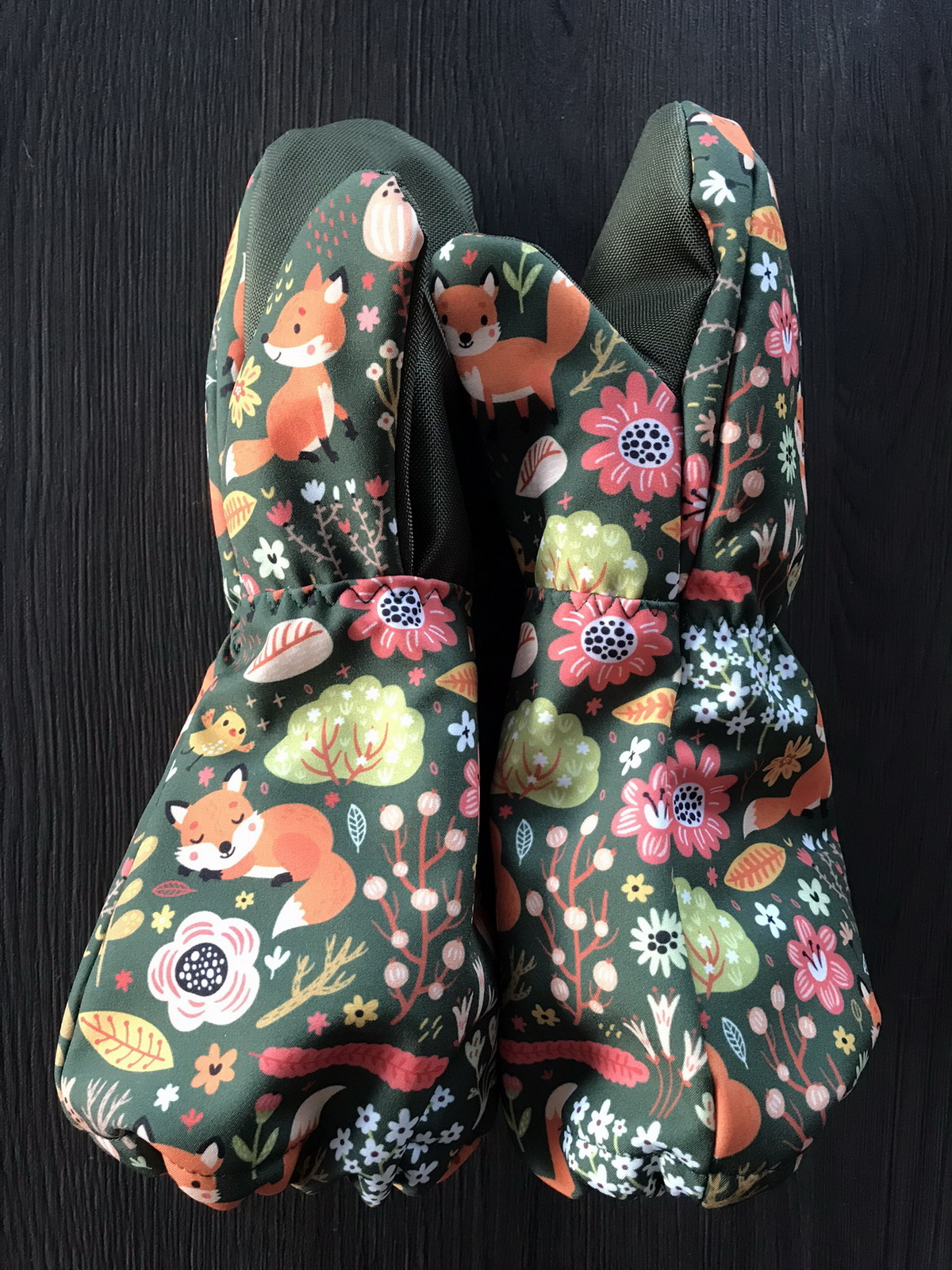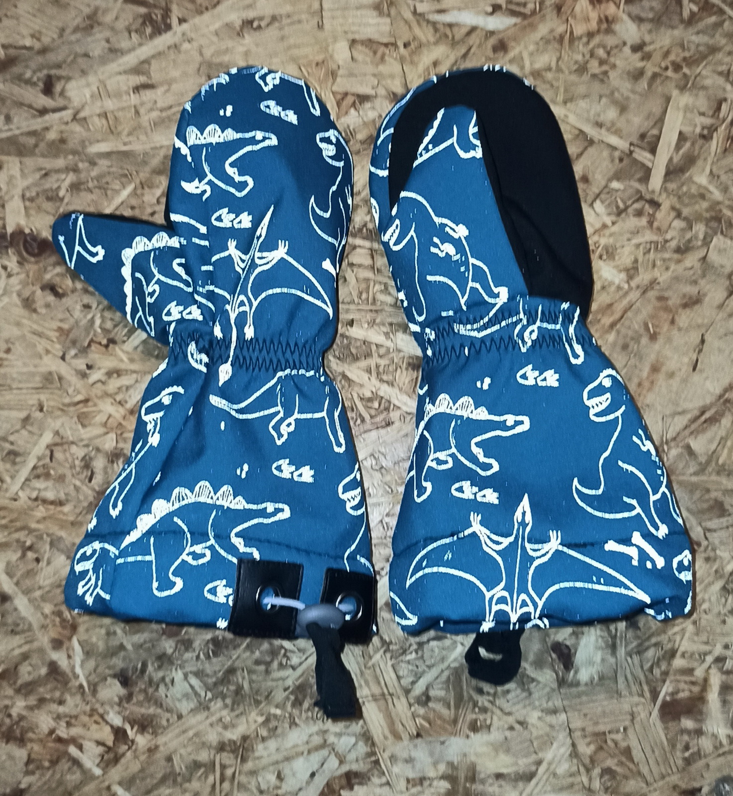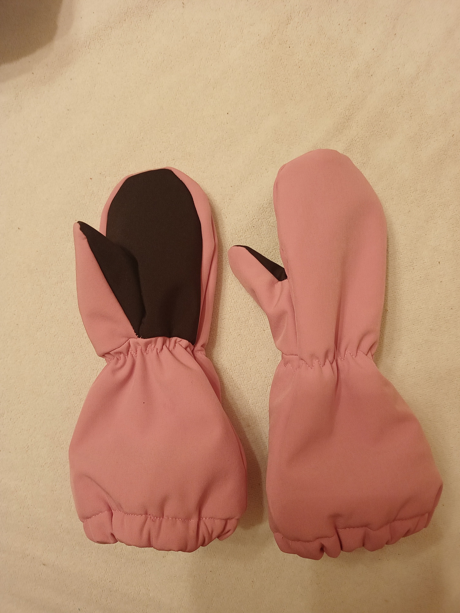 „Moje třetí :) Tyhle už šly jako po másle. Jsou pevnější než ze šusťáku, tepelně asi stejně. Ten softshell nám parametrově moc nevyhovuje... ale povrch je velmi příjemný. Warmkeeper jsem použila tak, že rubový chloupek je na dotykové straně, tisk nejde vidět (měla jsem takový akorátní zbytek). A to je velmi příjemná záležitost :) Syn maximálně spokojen. Už od rána je má na rukou a ani na snídani je nechtěl sundat. Ještě budu muset ušít pro synovce... Už jsme zkoušeli i ve sněhu a po dvou hodinách bobování cajk.“