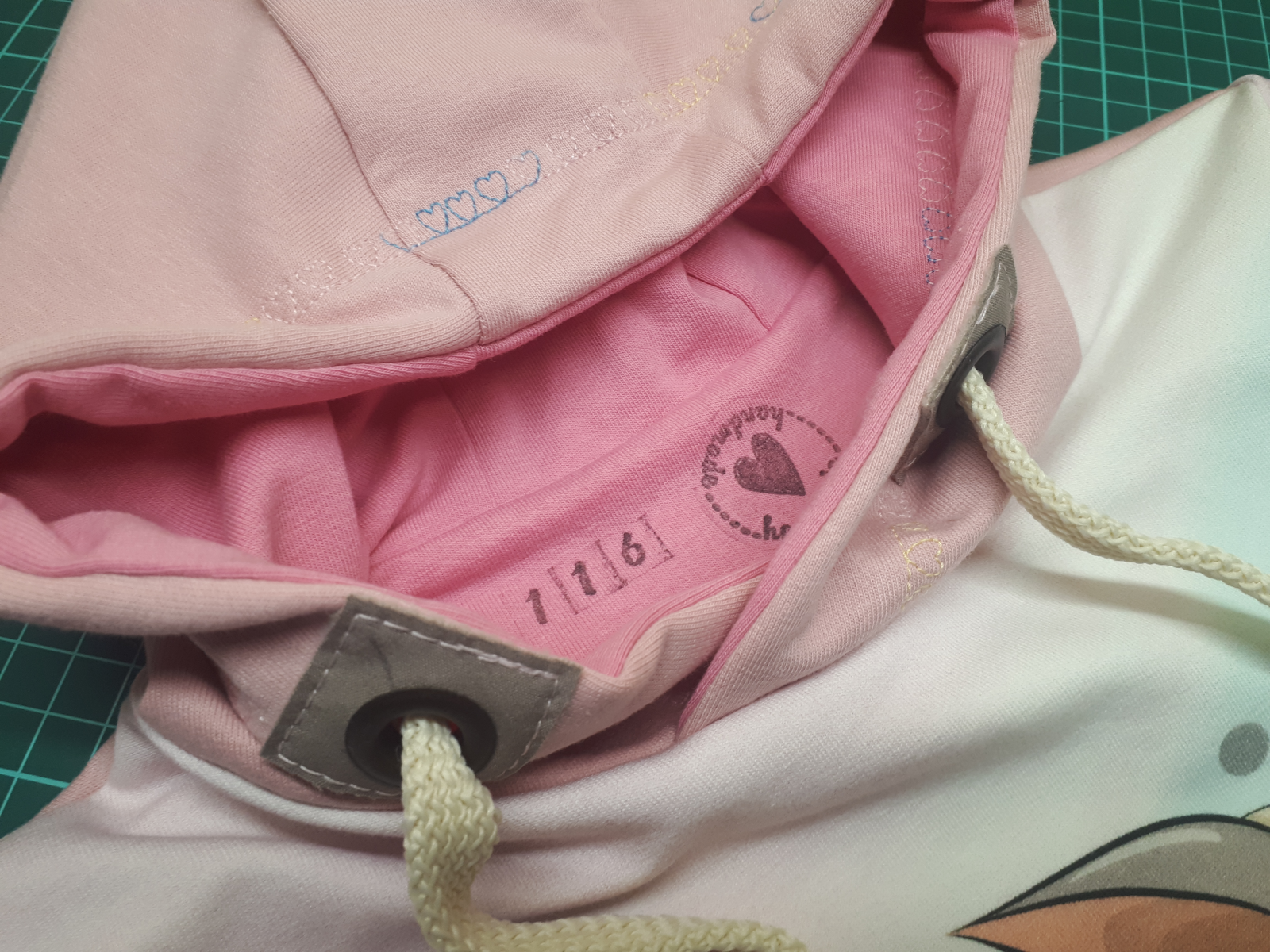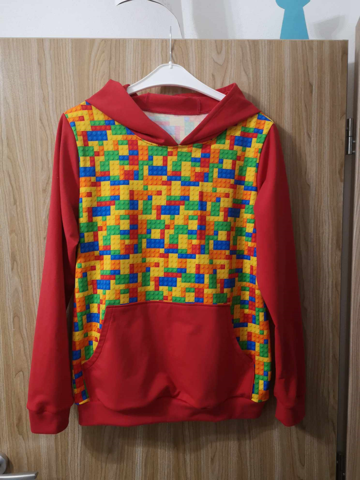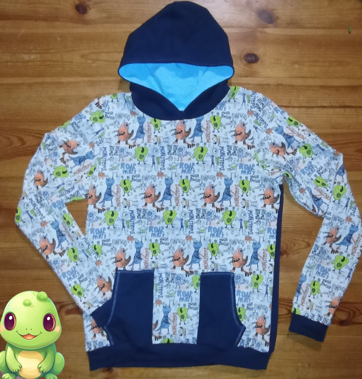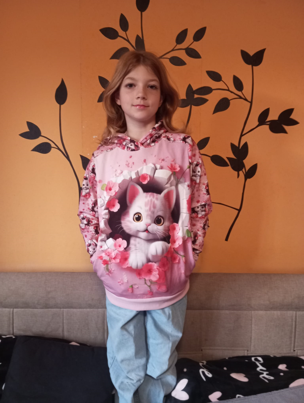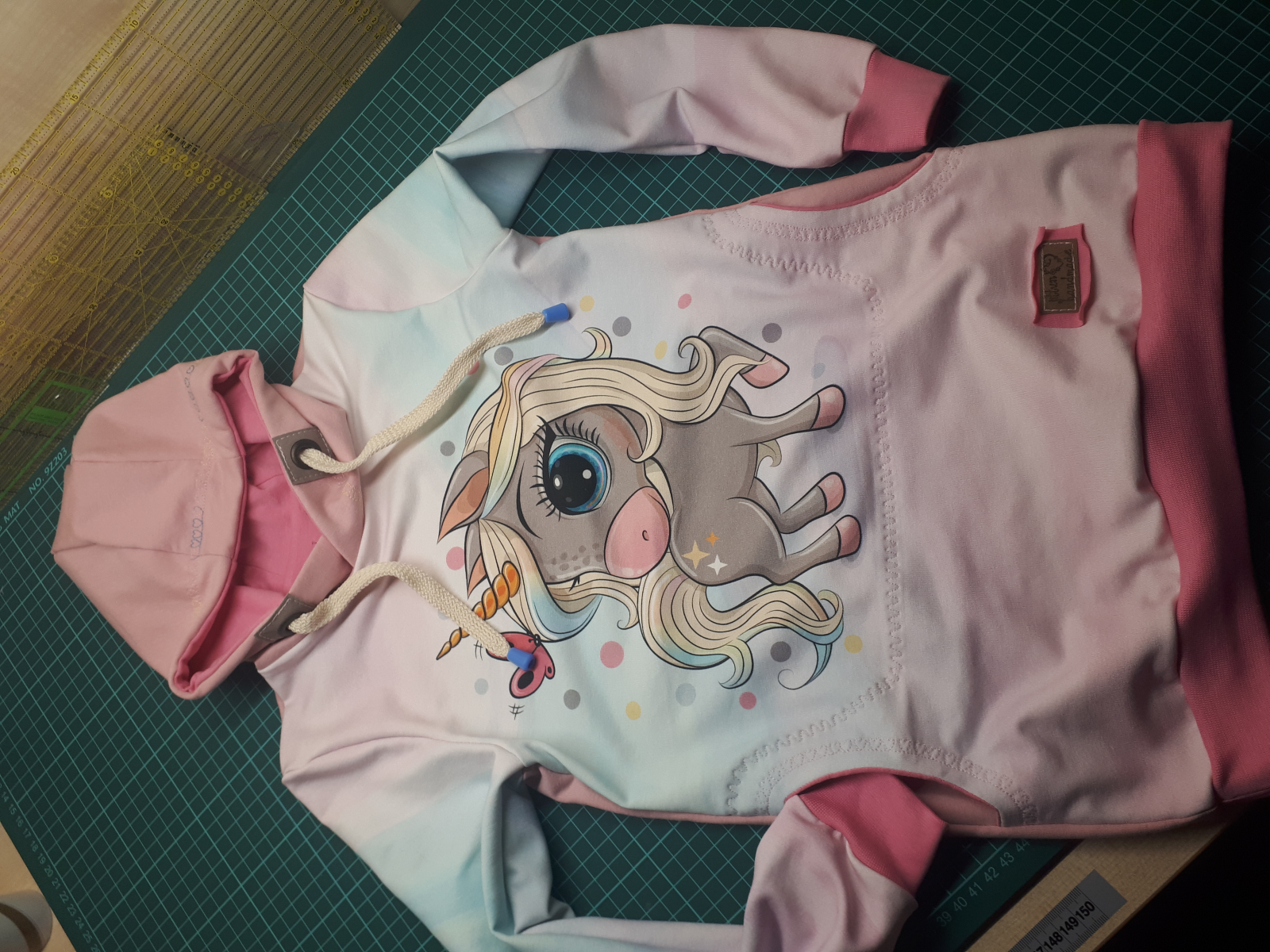 „Môj prvý mikinový počin, navyše s kapucňou. Šila sa super aj keď mi úplne nevyšla kapucňa vpredu prekrížená a pridala som klokanie vrecko.“