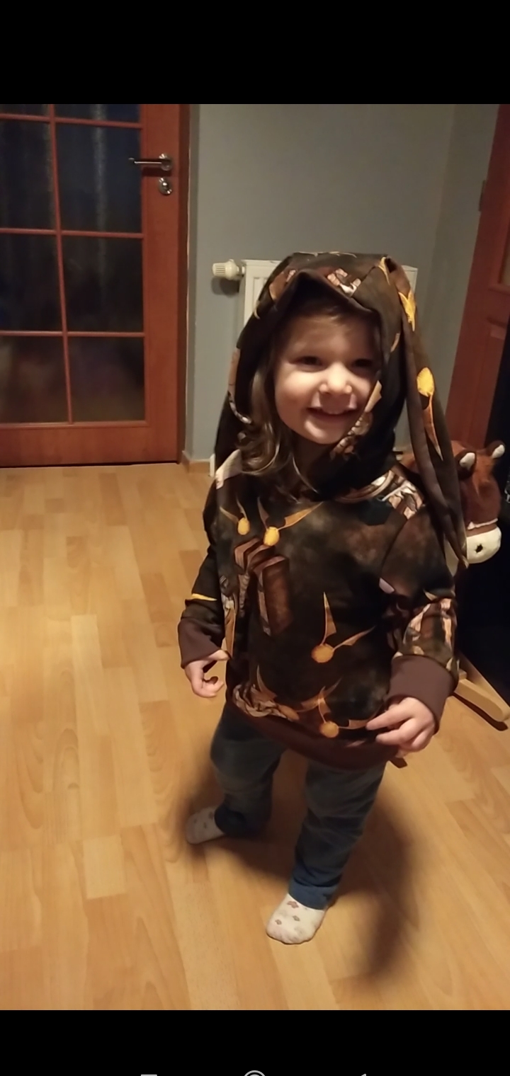 „Velikost sedí suprově a mikina je tak akorát, není ani opnutá, ani úplně pytloidní, takže opravdu jak pro holku, tak pro kluka. Ouška jsem si vypůjčila že střihu na vestu Viky. Určitě to není naposledy, co jsem podle "Michala" šila. :) Střih je jednoduchý a srozumitelný, jak já říkám "blbuvzdorný", navíc jsem využila možnost vytisknout si jej i s přídavky, takže šla práce opravdu raz dva. :)“